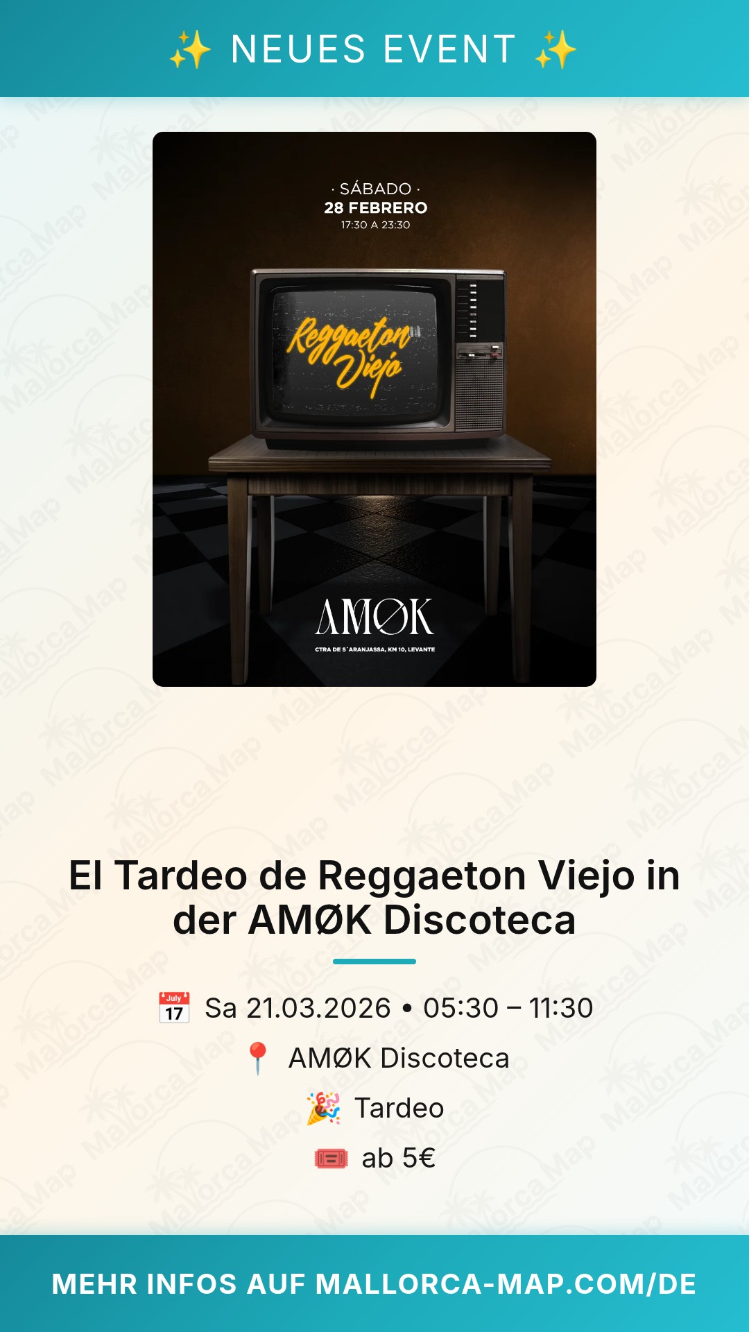 Bist du bereit für den ultimativen Samstagnachmittag auf Mallorca? Wenn die Sonne langsam tiefer sinkt und die Stimmung in S'Aranjassa steigt, gibt es nur einen Ort, an dem du sein solltest: die AMØK Discoteca. Bei "El Tardeo de Reggaeton Viejo" dreht sich alles um die Rhythmen, die wir alle lieben. Wir bringen dir die Klassiker zurück, die jede Tanzfläche zum Brennen bringen. Von "Gasolina" bis "Papi Chulo" – mach dich bereit für eine musikalische Zeitreise in die goldene Ära des Reggaeton.