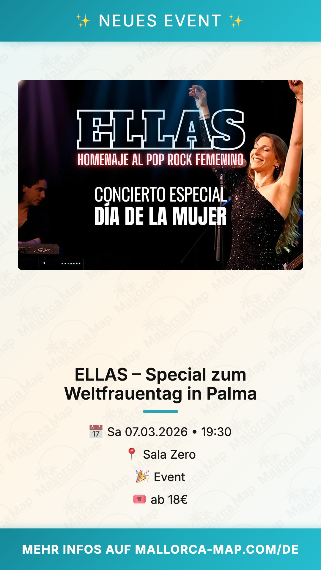 Am Samstag, den 7. März, erwartet dich ein ganz besonderes Highlight im Veranstaltungskalender von Palma: Das Event ELLAS – Especial Día de la Mujer in der Sala Zero von Es Gremi. Anlässlich des Weltfrauentags verwandelt sich die Bühne in einen Ort voller Energie und Emotionen, um das weibliche Talent gebührend zu feiern. Du kannst dich auf eine einzigartige Tribute-Show freuen, die weit über ein gewöhnliches Konzert hinausgeht und die ikonischsten Frauenstimmen der Musikgeschichte ehrt. Es ist die perfekte Gelegenheit, um gemeinsam mit deinen Freunden einen unvergesslichen Abend zu verbringen.