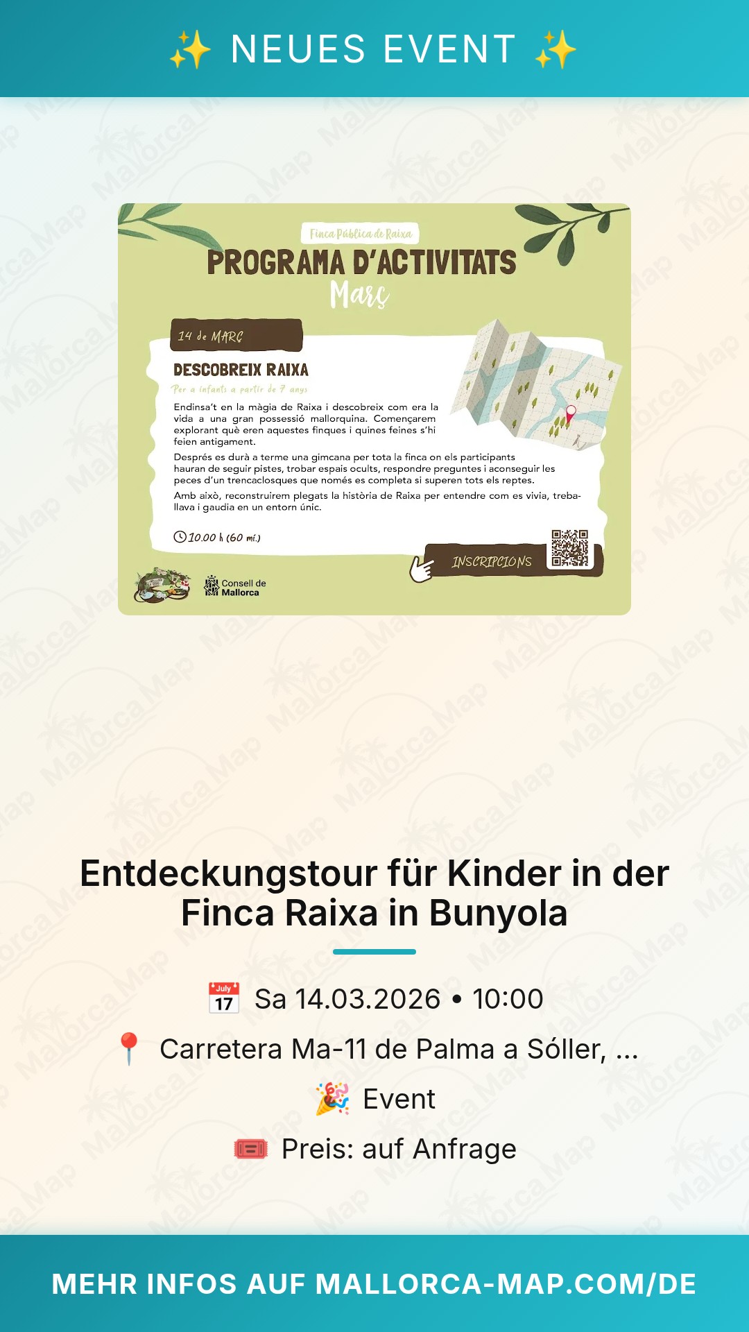 Packe deine Familie ein und verbringt einen unvergesslichen Vormittag an einem der geschichtsträchtigsten Orte der Insel. Die Anlage von Raixa bietet eine beeindruckende Kulisse, die sowohl Kinder als auch Erwachsene verzaubern wird. Sei dabei und entdecke mit uns die Magie von Raixa bei dieser interaktiven Reise in die Vergangenheit. Wir freuen uns darauf, euch am 14. März 2026 um 10:00 Uhr begrüßen zu dürfen. Ein tolles Erlebnis für kleine Forscher, das man nicht verpassen sollte!