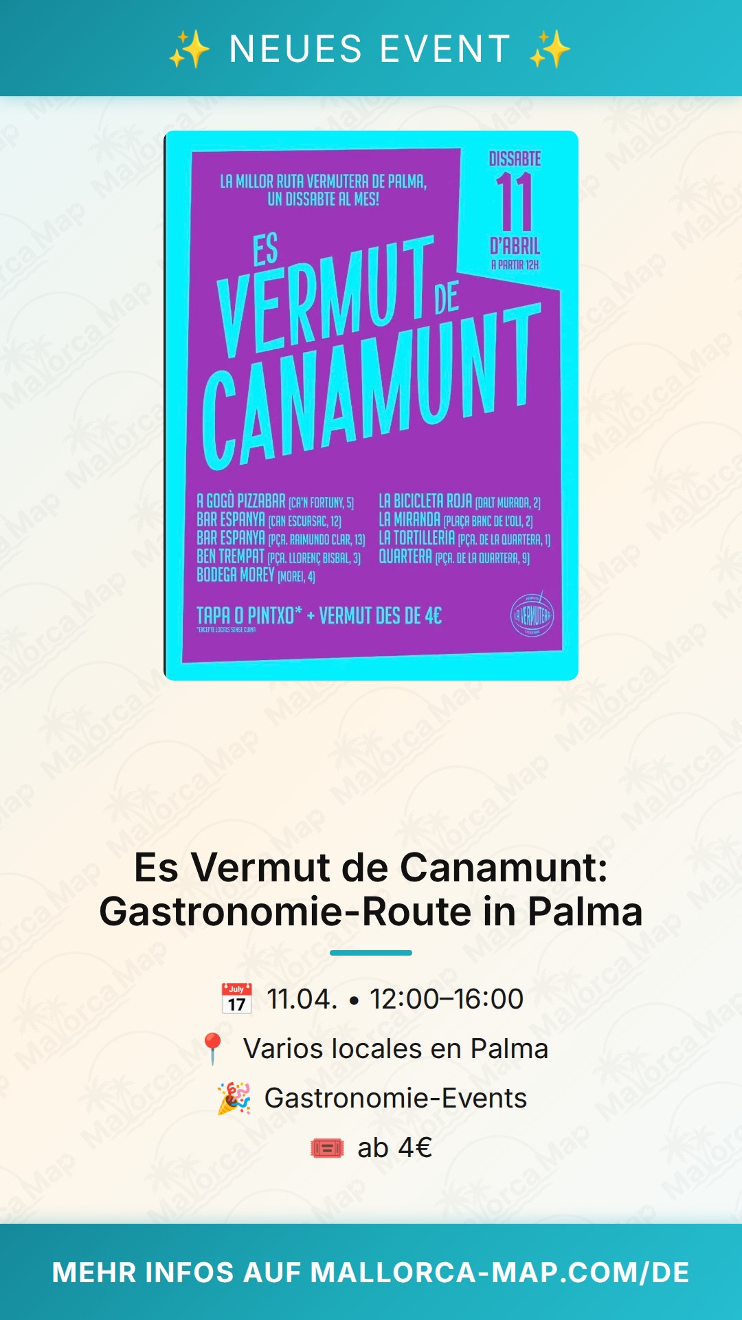 Das Event startet am 11. April 2026 pünktlich um 12:00 Uhr, wenn die Stadt so richtig zum Leben erwacht. Da die Route durch verschiedene teilnehmende Lokale in Palma führt, gibt es keinen starren Startpunkt – du kannst ganz flexibel dort einsteigen, wo es dir am besten gefällt. Mit einem fairen Einstiegspreis von etwa 4 Euro pro Kombination ist es zudem ein sehr zugängliches Vergnügen für jeden Geldbeutel. Schnapp dir deine Freunde, genieß die Frühlingssonne und verbringe einen unvergesslichen Mittag im Herzen von Palma. Wir sehen uns in Canamunt!
