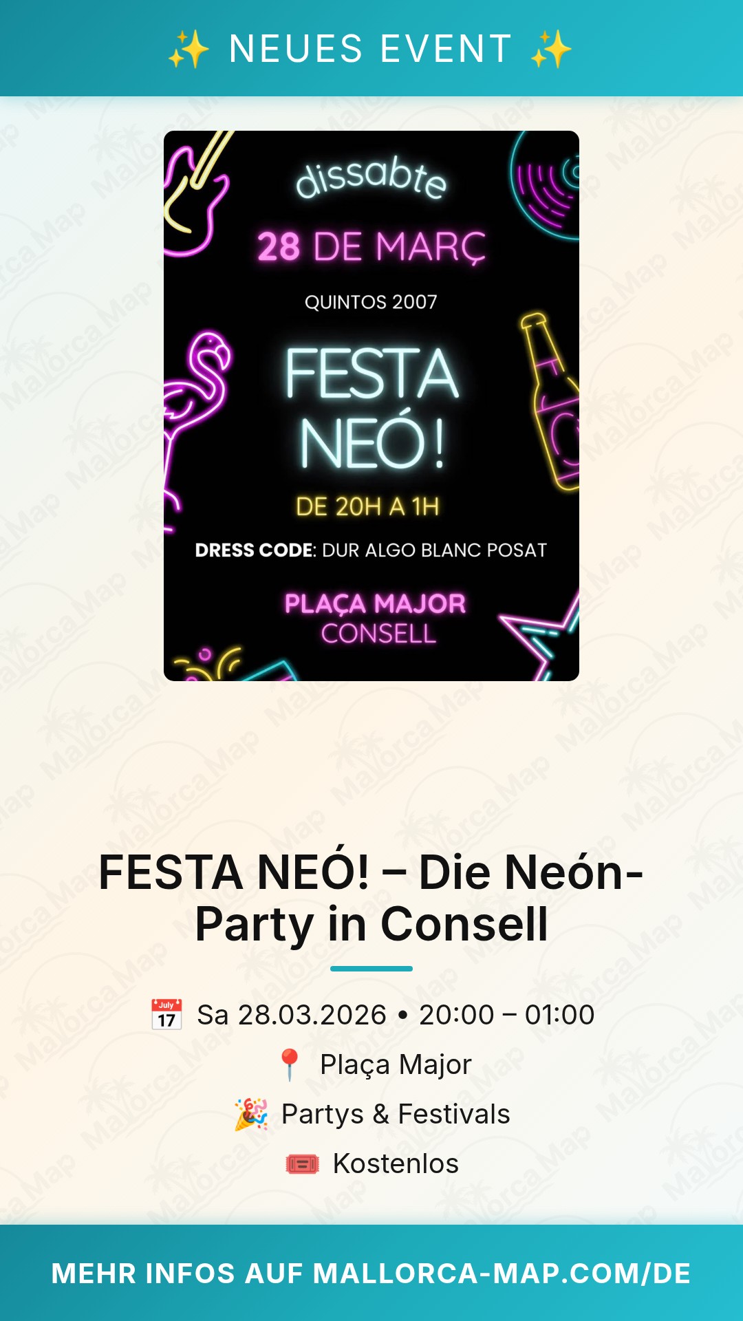 Willkommen zur FESTA NEÓ! in Consell. Wenn du Lust auf eine unvergessliche Nacht voller Farben, Licht und guter Laune hast, dann solltest du dir den 28. März 2026 dick im Kalender markieren. Mitten im Herzen von Mallorca verwandelt sich die Plaça Major von Consell in ein leuchtendes Meer aus Neonfarben. Diese besondere Party wird von den Quintos 2007 organisiert – einer lokalen Tradition, bei der die jungen Erwachsenen eines Jahrgangs gemeinsam ein großes Fest für das ganze Dorf auf die Beine stellen. Es erwartet dich eine authentische mallorquinische Atmosphäre, die Tradition und moderne Partystimmung perfekt verbindet.