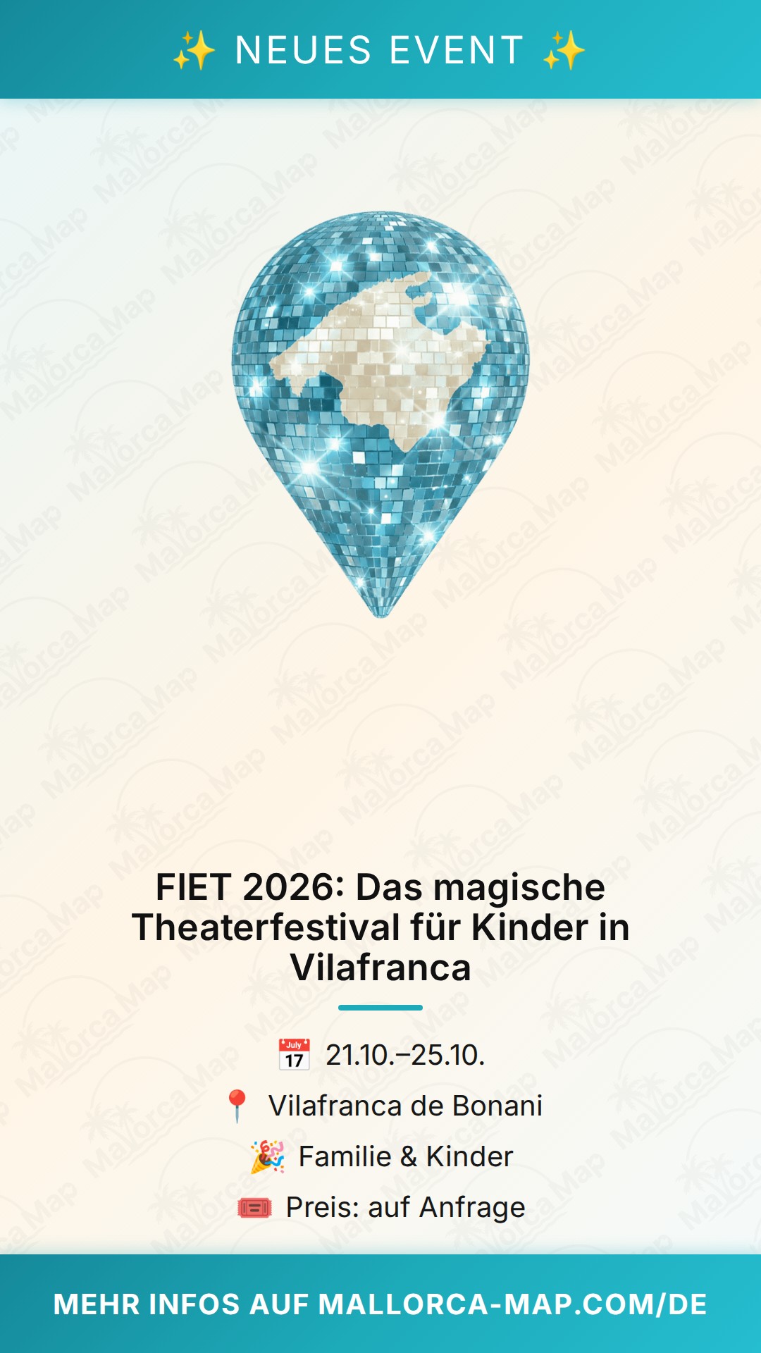 Da das Festival am 21. Oktober 2026 stattfindet, ist es eine wunderbare Möglichkeit, den Herbst auf Mallorca von seiner kulturell wertvollsten Seite zu erleben. Bitte beachte, dass es sich um eine kostenpflichtige Veranstaltung handelt, was die hohe Qualität der Produktionen unterstreicht. Wir empfehlen dir, deine Pläne rechtzeitig zu machen, um keine der magischen Vorstellungen zu verpassen. Pack deine Familie ein und komm vorbei, um gemeinsam in Vilafranca de Bonany in die Welt des Theaters einzutauchen – wir sehen uns beim FIET 2026!