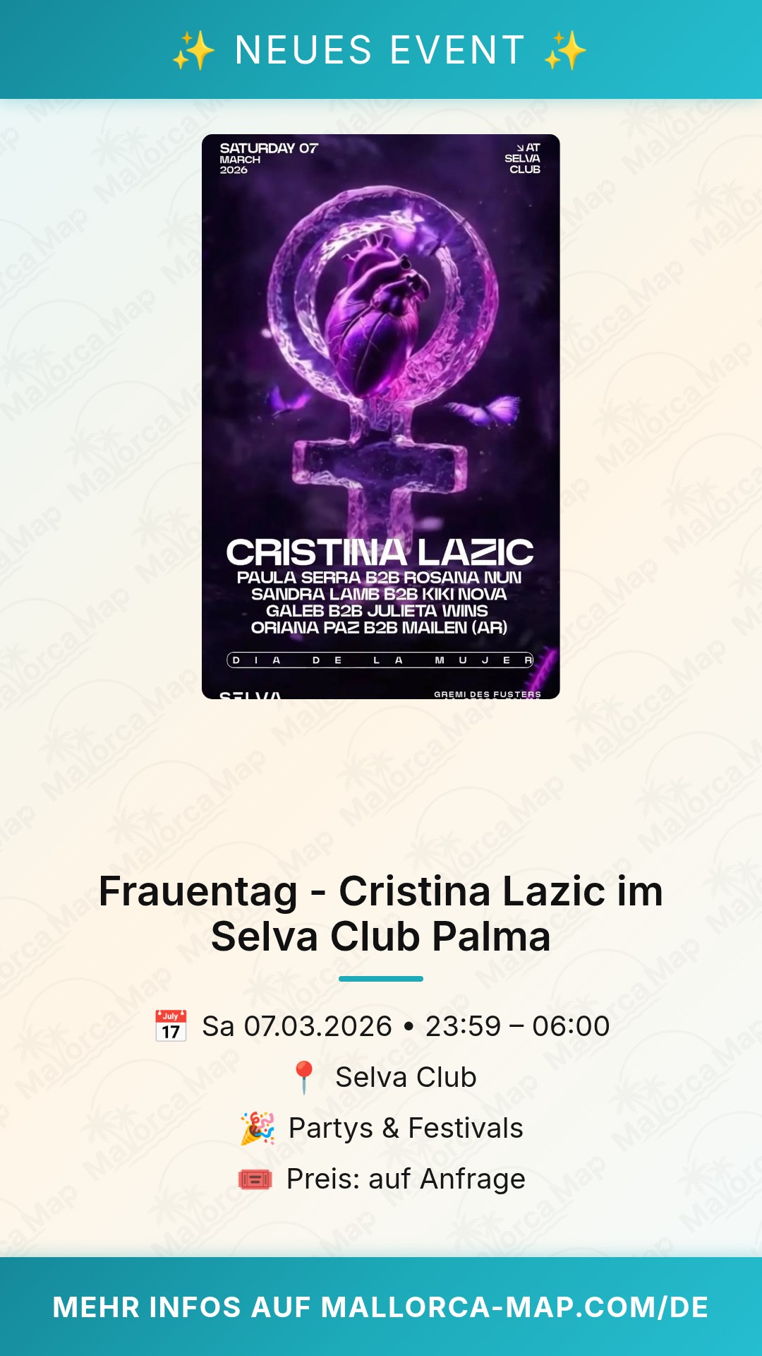 Da das Event direkt vor dem offiziellen Frauentag am 8. März stattfindet (Start um 23:59 Uhr), markiert es den idealen Übergang in diesen wichtigen Feiertag. Pack deine Tanzschuhe ein und mach dich bereit für eine Nacht voller Rhythmus, Leidenschaft und Inspiration. Wir empfehlen dir, frühzeitig vor Ort zu sein, um das gesamte Lineup von Anfang an mitzuerleben. Der Selva Club in der Calle Gremi des Fusters 33 ist gut erreichbar und bietet die perfekte Bühne für eine ekstatische Partynacht. Wir sehen uns auf dem Dancefloor!