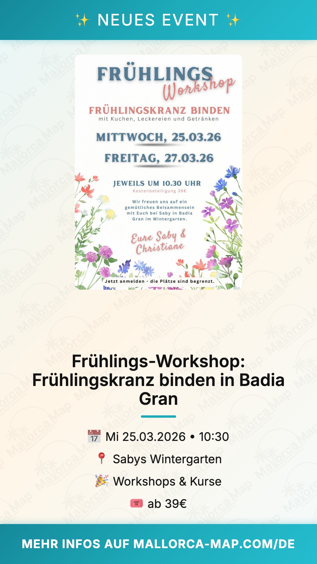 Der Workshop beginnt am Vormittag und ist preislich moderat gestaltet, wobei alle benötigten Materialien bereits im Preis enthalten sind. Da die Teilnehmerzahl für dieses exklusive Event begrenzt ist, solltest du dir rechtzeitig deinen Platz sichern. Nutze diese Chance für ein kreatives Erlebnis in Llucmajor und melde dich noch heute an. Wir freuen uns darauf, gemeinsam mit dir den Frühling auf Mallorca zu begrüßen und einen unvergesslichen Vormittag voller Inspiration und Handwerkskunst zu verbringen.