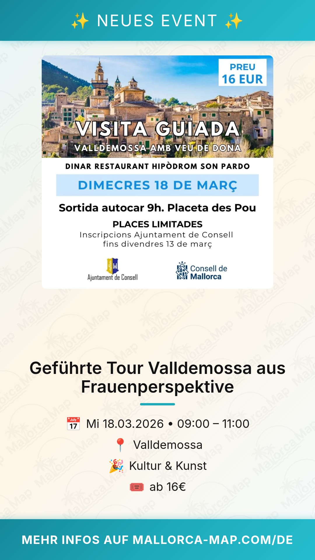 Möchtest du Valldemossa auf eine ganz neue und tiefgründige Weise entdecken? Wenn du Lust hast, die Geschichte dieses malerischen Bergdorfs in der Serra de Tramuntana aus einer weiblichen Perspektive zu erleben, dann ist diese geführte Tour genau das Richtige für dich. Am 18. März 2026 laden wir dich ein, die verborgenen Geschichten und den kulturellen Reichtum von Valldemossa bei der Veranstaltung "Valldemossa amb veu de dona" zu erkunden.