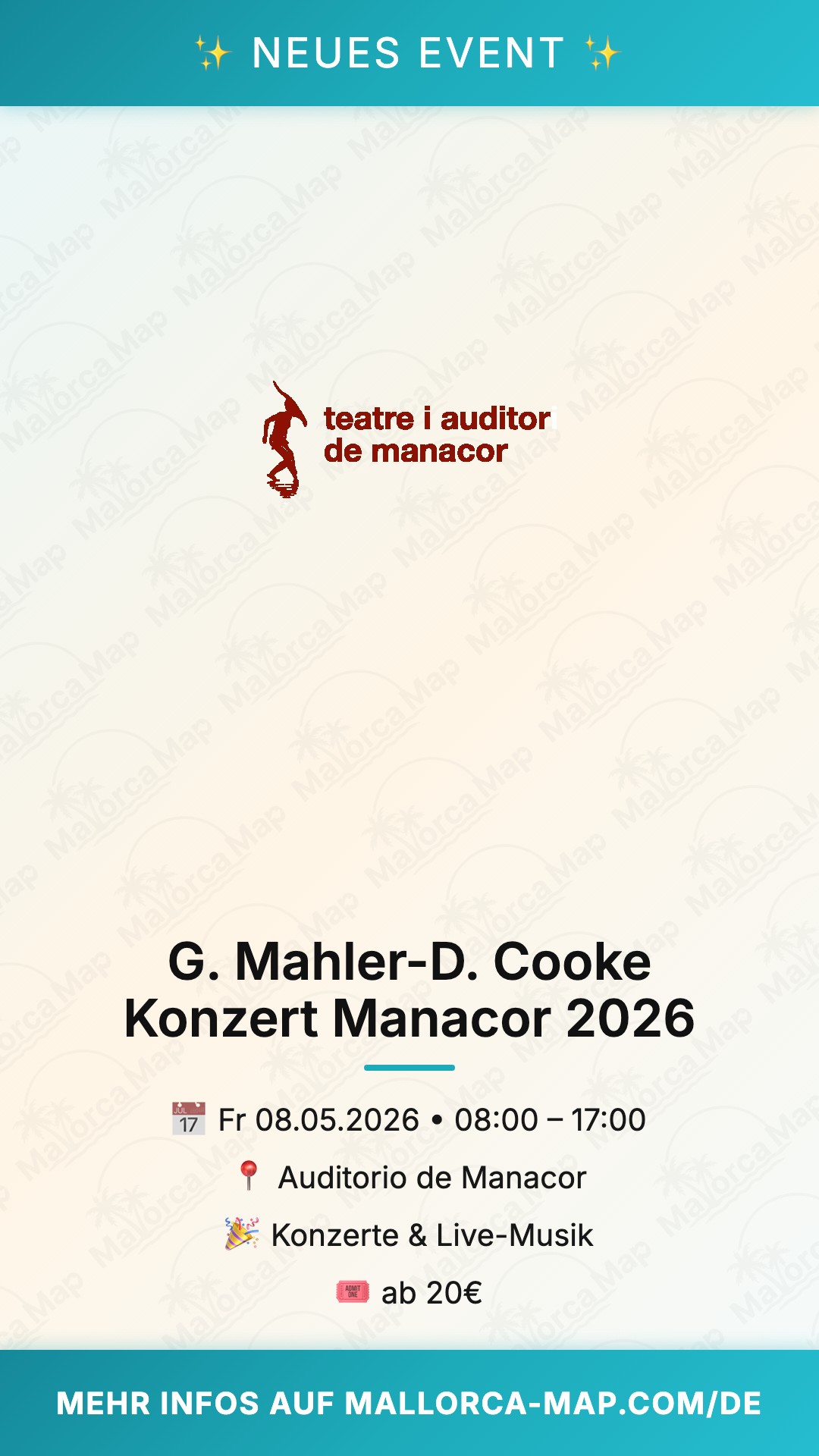 Bist du bereit für ein außergewöhnliches musikalisches Erlebnis auf Mallorca? Das G. Mahler-D. Cooke Konzert Manacor am 8. Mai 2026 verspricht ein Highlight für alle Liebhaber anspruchsvoller Klänge zu werden. Im Auditorio de Manacor erwartet dich eine Aufführung, die tief unter die Haut geht. Erlebe die Meisterwerke von Gustav Mahler in der Bearbeitung von Deryck Cooke und lass dich von der emotionalen Intensität dieses Abends verzaubern.