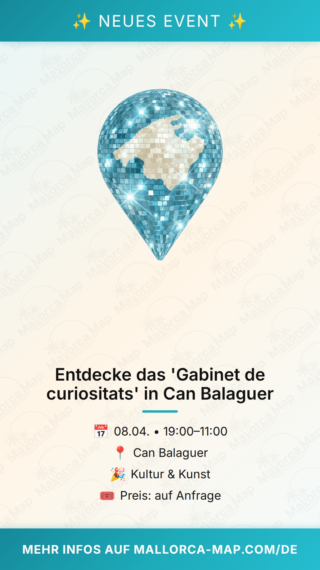 Planst du bereits deinen Besuch? Das Can Balaguer befindet sich zentral in der Altstadt von Palma und ist wunderbar in einen Stadtbummel zu integrieren. Nimm dir Zeit, um nicht nur die Ausstellung, sondern auch die prachtvollen Räumlichkeiten des Gebäudes zu genießen. Wir laden dich herzlich ein, diesen besonderen Ort zu besuchen und dich von den Kuriositäten verzaubern zu lassen. Da es sich um eine Ausstellung handelt, die viele Besucher anlockt, empfiehlt es sich, den Besuch frühzeitig in deinen Tagesplan für Palma einzuplanen.
