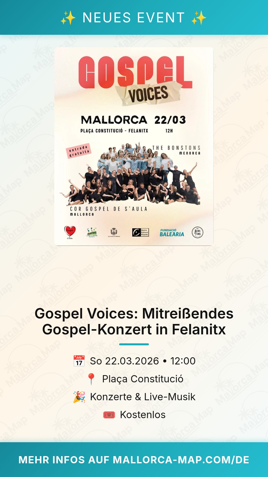 Hast du schon mal die Kraft von Gospelmusik live gespürt? Am 22. März 2026 hast du in Felanitx die perfekte Gelegenheit dazu. Die Gruppe Gospel Voices tritt auf der Plaça Constitució auf und bringt eine Mischung aus Energie, Leidenschaft und tiefen Emotionen direkt in das Herz der Stadt. Wenn du auf Mallorca bist und Lust auf ein kulturelles Highlight abseits der typischen Touristenpfade hast, solltest du dir diesen Termin rot im Kalender markieren.
