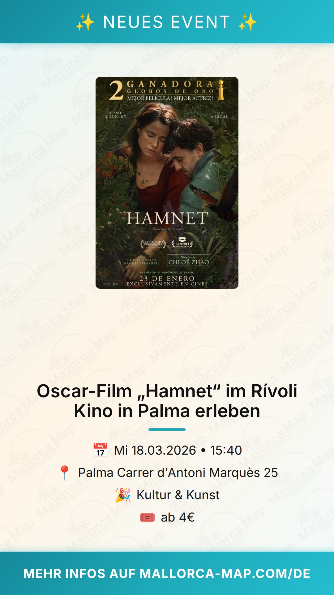 Wenn du die cineastische Atmosphäre in Palma liebst, dann solltest du dir diesen Termin vormerken: Am 18. März 2026 hast du die Gelegenheit, den Oscar-prämierten Film „Hamnet“ auf der großen Leinwand im renommierten Rívoli Kino zu sehen. Das Rívoli ist weit über die Grenzen von Palma hinaus für seinen nostalgischen Charme und das anspruchsvolle Programm bekannt. Es ist der perfekte Ort, um in eine Geschichte einzutauchen, die durch ihre emotionale Tiefe und filmische Qualität überzeugt.