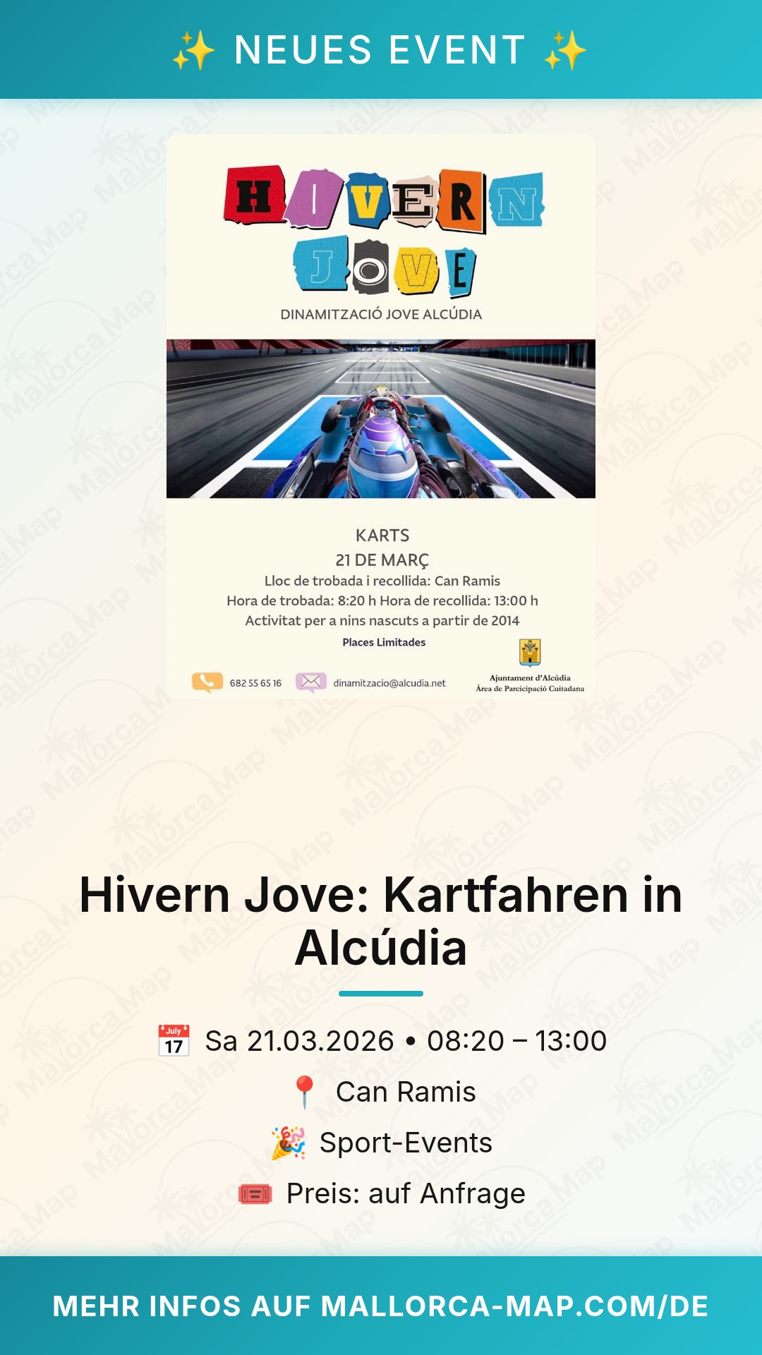 Das Event findet am Samstag, den 21. März 2026, statt. Treffpunkt ist das bekannte Kulturzentrum Can Ramis in Alcúdia. Von dort aus startet das Abenteuer, das speziell für die jüngere Generation der Gemeinde konzipiert wurde. "Hivern Jove" (Junger Winter) ist eine Initiative, die darauf abzielt, Jugendlichen in den kühleren Monaten spannende und aktive Freizeitmöglichkeiten zu bieten. Kartfahren steht dabei ganz oben auf der Beliebtheitsskala, da es Wettbewerbsgeist mit purem Fahrspaß verbindet.