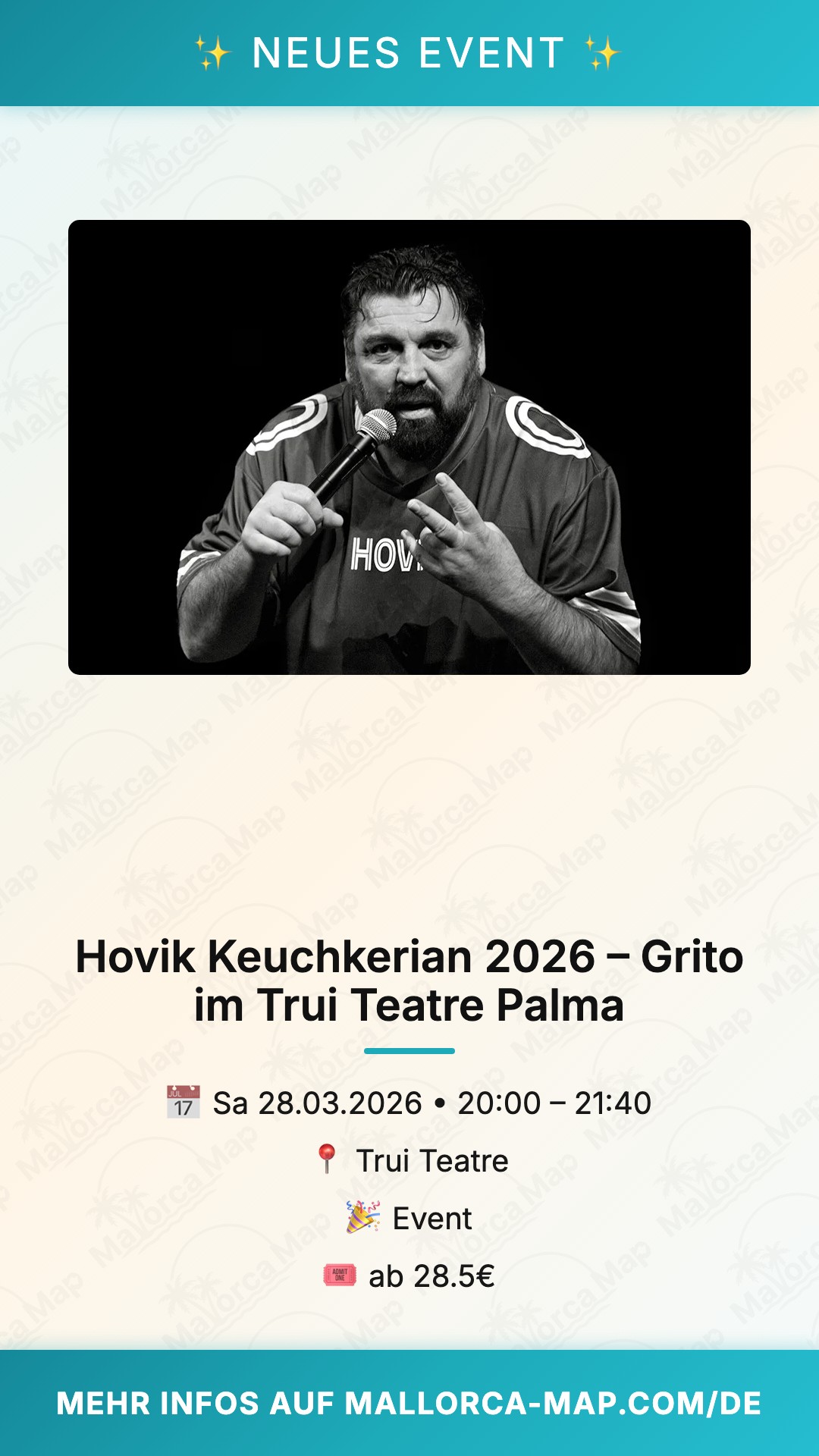 Bekannt durch seine ikonischen Rollen, wie etwa in der Welterfolgsserie „Haus des Geldes“, bringt Hovik Keuchkerian seine ganze künstlerische Bandbreite auf die Bühne Mallorcas. In "Grito" verschmelzen Poesie, tiefgründige Reflexionen und eine unbändige Energie zu einem unvergesslichen Gesamtkunstwerk. Die Inszenierung besticht durch ihre authentische Sprache und die Fähigkeit des Künstlers, den Raum allein mit seiner Stimme und Präsenz zu füllen. Unterstützt durch die professionelle Produktion von ¿Cómo está Wally? wird dieser Abend im Trui Teatre zu einem kulturellen Höhepunkt des Frühjahrs 2026 in Palma de Mallorca.
