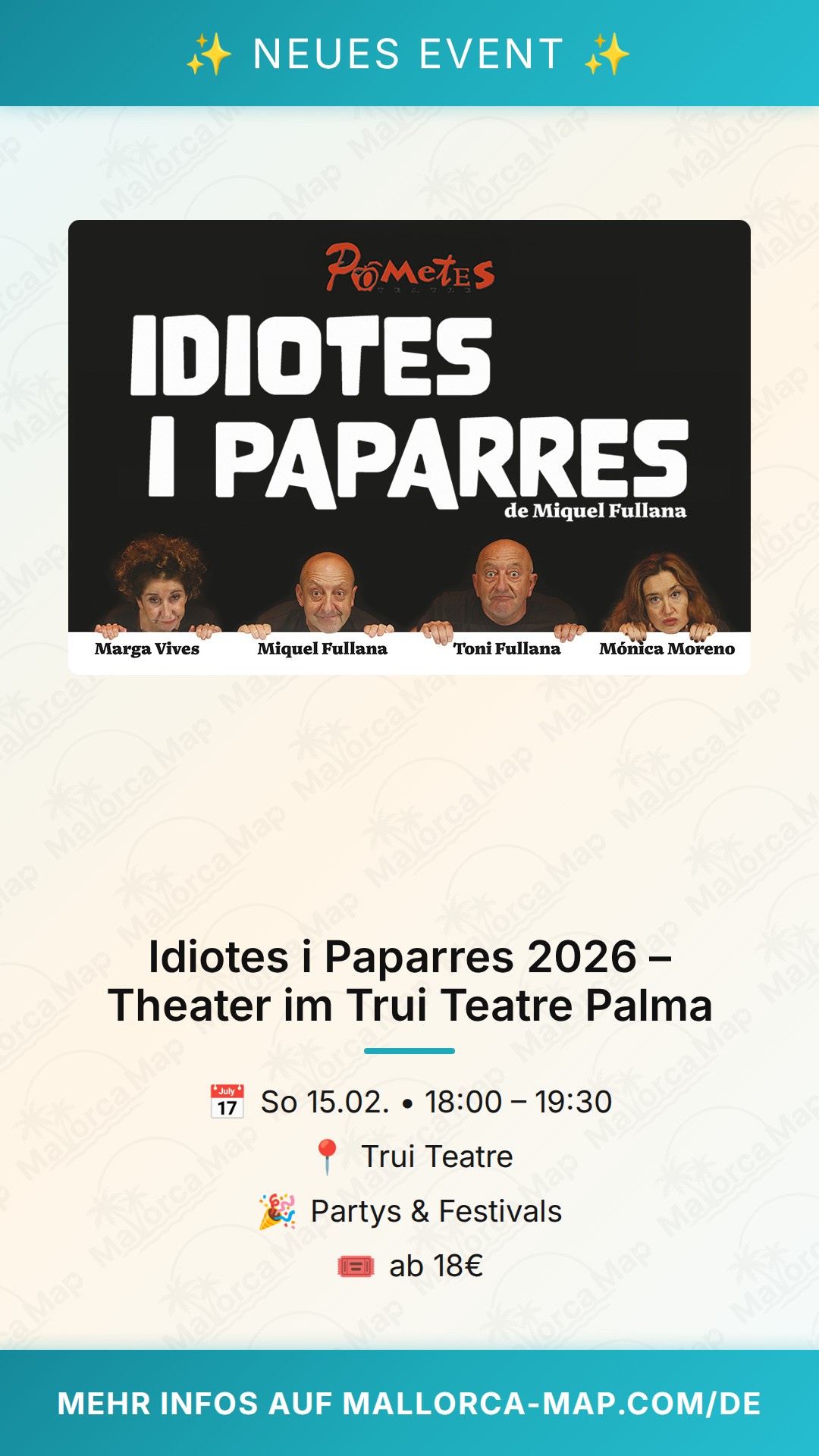 Du erlebst einen Abend voller Humor und mallorquinischem Charme, wenn die neue Komödie Idiotes i Paparres am 15. Februar 2026 die Bühne des Trui Teatre in Palma erobert. Diese Produktion von Pometes Teatre, unter der Regie von Miquel Fullana, verspricht eine erfrischende Mischung aus Sketchen, amüsanten Geschichten und kurzen Monologen. Das Trui Teatre am Camí Son Rapinya bietet hierfür den perfekten Rahmen für ein kulturelles Highlight in der Inselhauptstadt, das weit über die üblichen Touristenattraktionen hinausgeht.