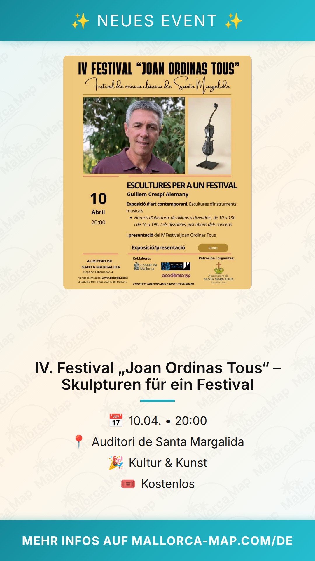 Bist du bereit für einen Abend voller Inspiration und Ästhetik im Herzen von Mallorca? Das IV. Festival „Joan Ordinas Tous“ lädt dich am 10. April 2026 in das Auditori de Santa Margalida ein. Unter dem Motto „Escultures per a un festival“ – Skulpturen für ein Festival – erwartet dich eine einzigartige Symbiose aus bildender Kunst und klangvoller Musik. Dieses Event hat sich fest im Kulturkalender der Gemeinde Santa Margalida etabliert und bietet Einheimischen sowie Besuchern die Möglichkeit, tief in die lokale Kunstszene einzutauchen.