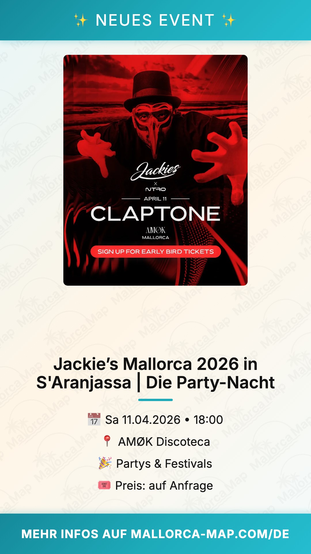 Bist du bereit für das ultimative Highlight im Frühling? Am 11. April 2026 verwandelt sich S'Aranjassa in das Epizentrum der guten Laune, wenn Jackie’s Mallorca 2026 an den Start geht. Diese legendäre Party auf Mallorca verspricht eine Nacht voller Energie, bei der du gemeinsam mit Gleichgesinnten unter freiem Himmel tanzt. Freue dich auf mitreißende Beats, eine erstklassige Lichtshow und die unvergleichliche Atmosphäre, die nur diese Eventreihe bieten kann. Es ist der perfekte Start in die neue Saison für alle Feierwütigen auf der Insel.
