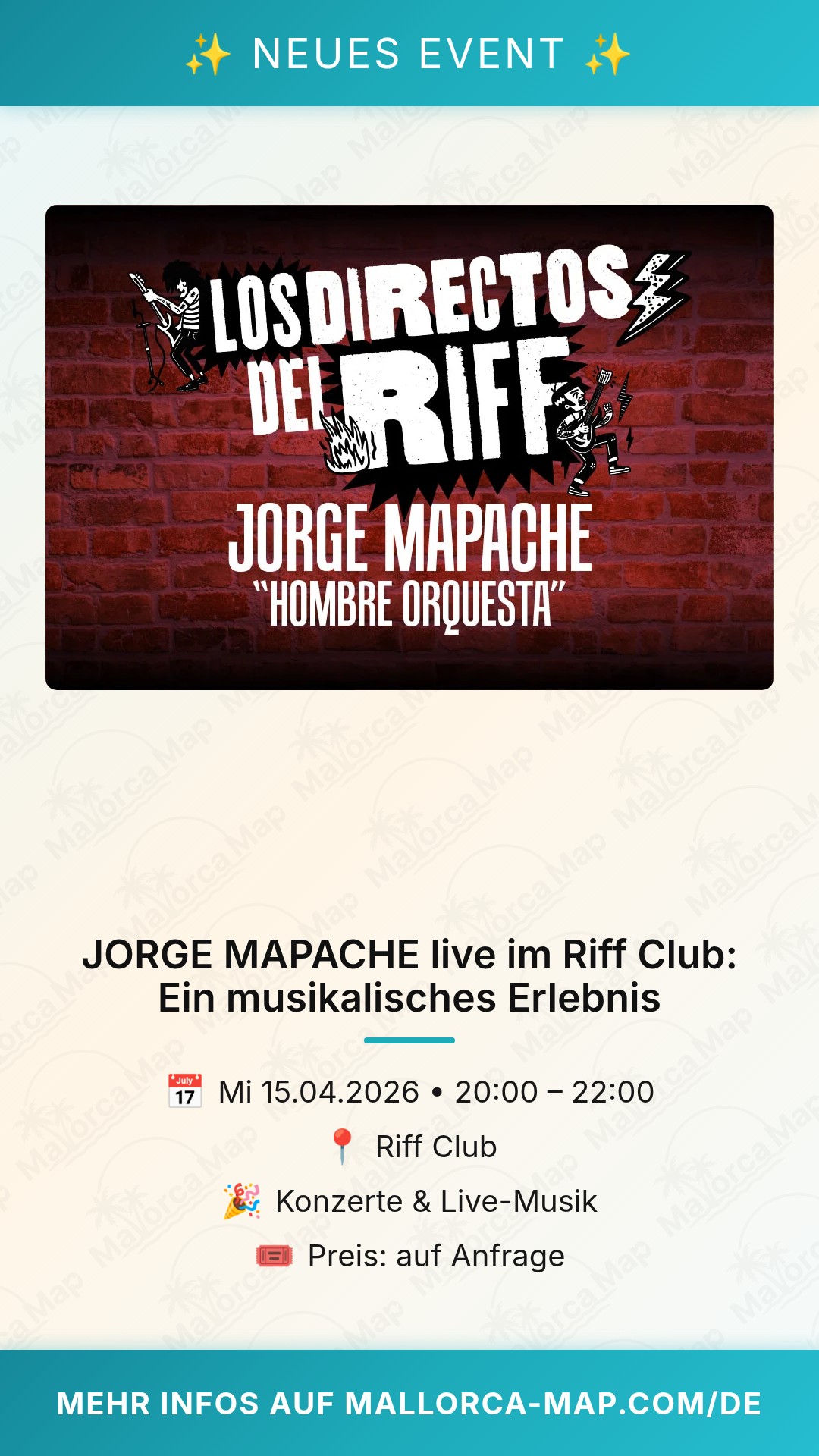Da solche besonderen Auftritte im Riff Club meist auf großes Interesse stoßen, empfehlen wir dir, den Termin fest in deinem Kalender zu markieren. Schnapp dir deine Freunde, genießt gemeinsam die lockere Stimmung und lasst euch von der Performance des „Hombre Orquesta“ begeistern. Wir freuen uns darauf, dich bei diesem Konzert begrüßen zu dürfen und gemeinsam einen unvergesslichen Abend zu erleben. Komm vorbei und lass dich von der musikalischen Vielseitigkeit mitreißen, die Jorge Mapache auf die Bühne bringt. Es wird ein Abend voller Rhythmus, Talent und purer Lebensfreude direkt hier auf Mallorca.