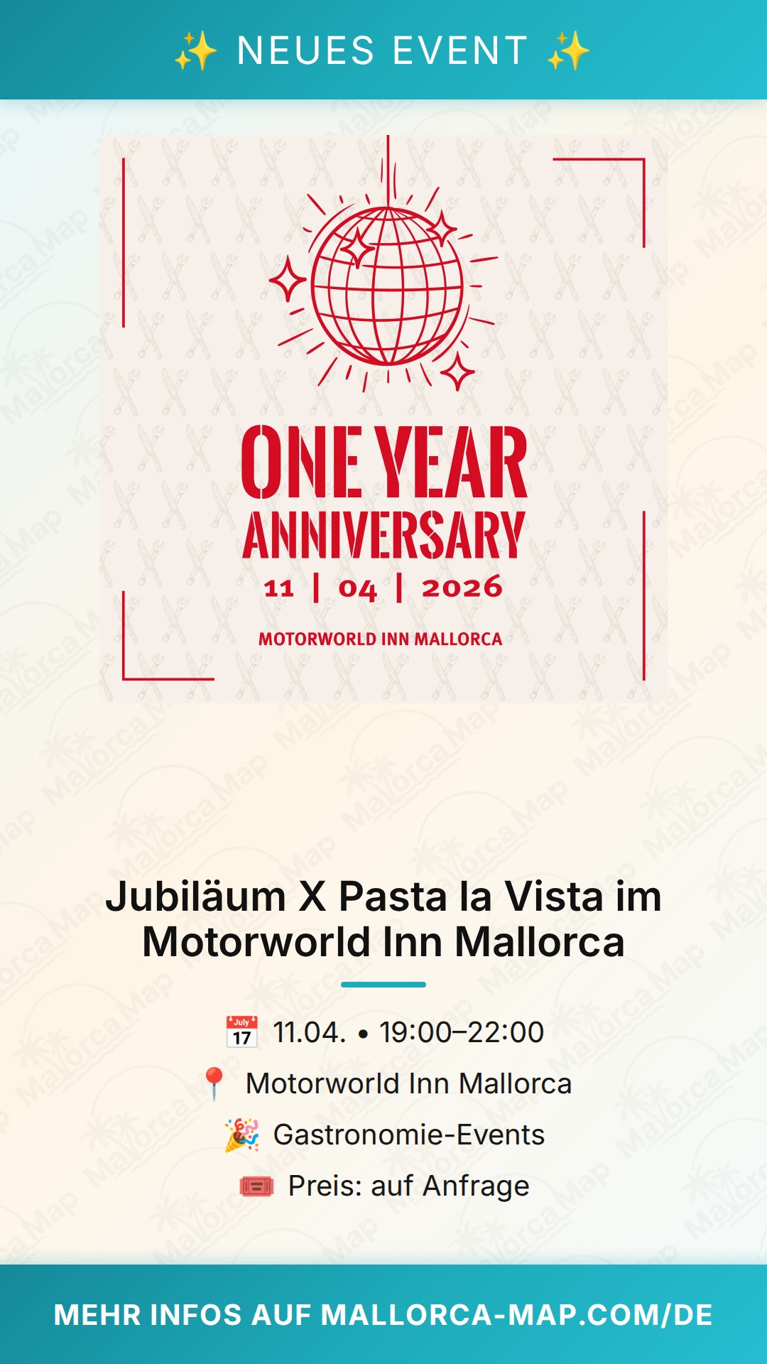 Wir freuen uns darauf, dich bei diesem kulinarischen Jubiläum begrüßen zu dürfen. Es ist die perfekte Gelegenheit, um die Geschmacksvielfalt der Pasta-Küche in einem Ambiente zu erleben, das weit über das Gewöhnliche hinausgeht. Schnapp dir deine Freunde, genieße den Abend bei einem Glas Wein und feiere mit uns „Pasta la Vista“. Wir sehen uns im Motorworld Inn Mallorca – lass dir dieses Event nicht entgehen und erlebe einen Abend, der dir sicher in bester Erinnerung bleiben wird. Schau am besten direkt online nach weiteren Details und plane deinen Besuch bei uns auf Mallorca.