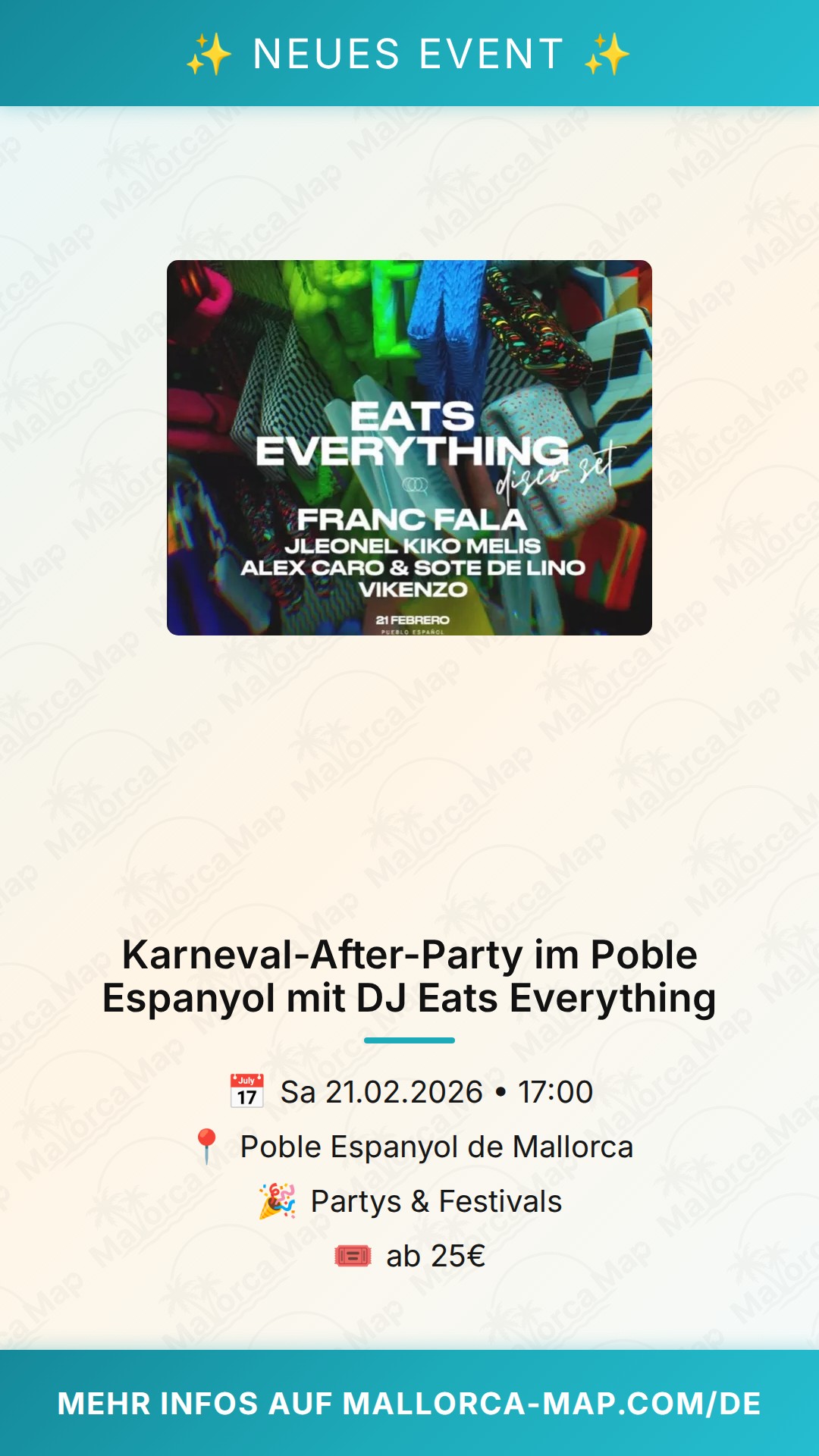 Bist du bereit für die ultimative Karneval-Eskalation in Palma? Wenn der offizielle Karnevalsumzug endet, fängt der Spaß im Poble Espanyol erst richtig an. Am 21. Februar 2026 verwandelt sich das beeindruckende Freilichtmuseum in eine der heißesten Tanzflächen der Insel. Die Karneval-After-Party verspricht eine Nacht voller Energie, erstklassiger elektronischer Musik und einer Atmosphäre, die du so schnell nicht vergessen wirst.