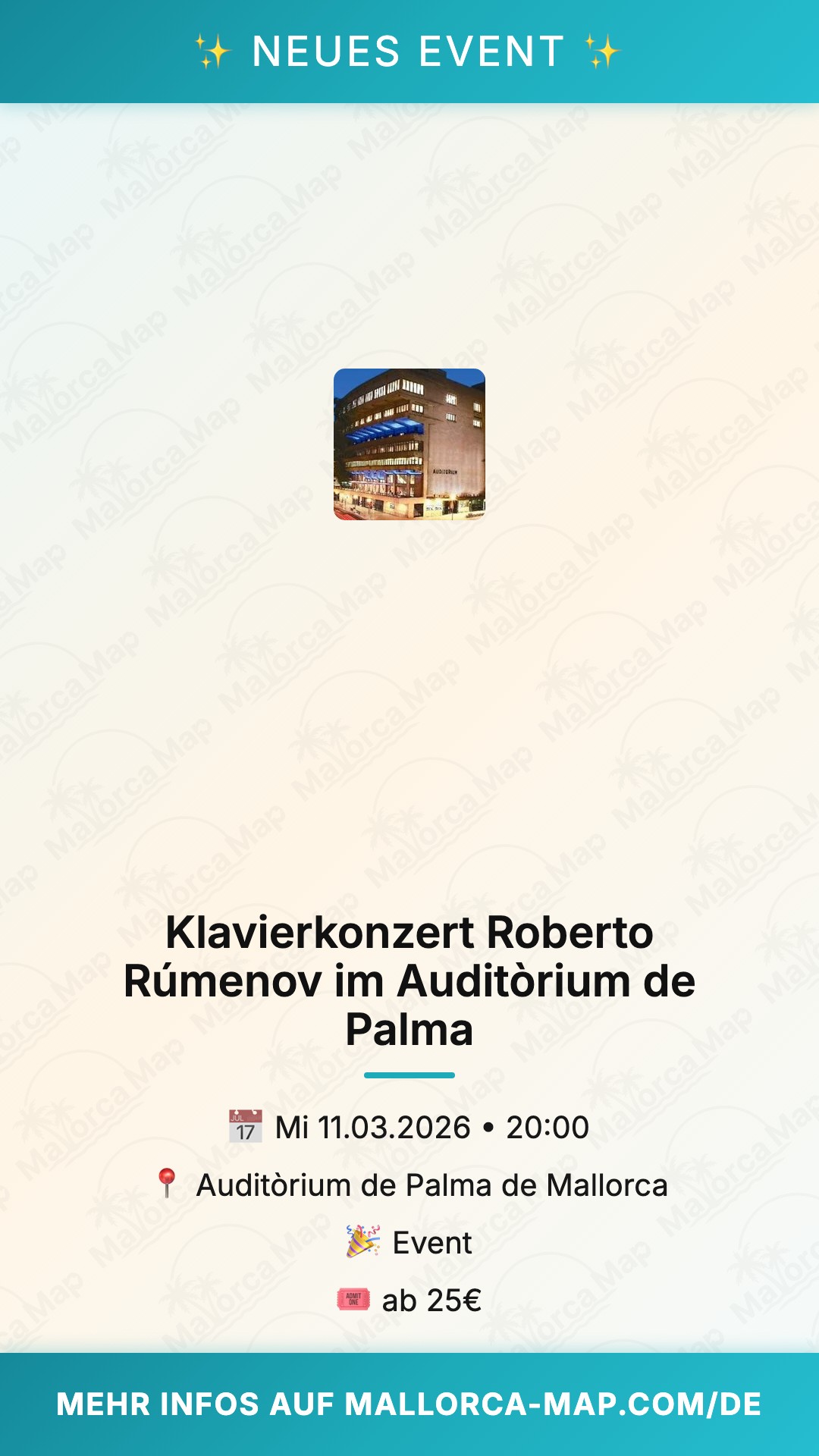 Das Auditòrium de Palma liegt zentral in der Avenida de Gabriel Roca 18 und ist bekannt für seine erstklassige Akustik. Das Konzert beginnt um 20:00 Uhr, sodass du vorher vielleicht noch einen entspannten Spaziergang am Paseo Marítimo machen kannst. Da die Plätze für dieses besondere Benefizkonzert begrenzt sind, empfehlen wir dir, nicht zu lange zu warten. Der Eintrittspreis von 25 Euro ist eine wunderbare Investition in hochkarätige Kultur und ein wichtiges soziales Projekt zugleich. Schnapp dir deine Freunde oder deine Familie und genieße einen unvergesslichen Abend voller Inspiration und Herzlichkeit in Palma. Wir freuen uns darauf, dich bei diesem klangvollen Ereignis begrüßen zu dürfen!