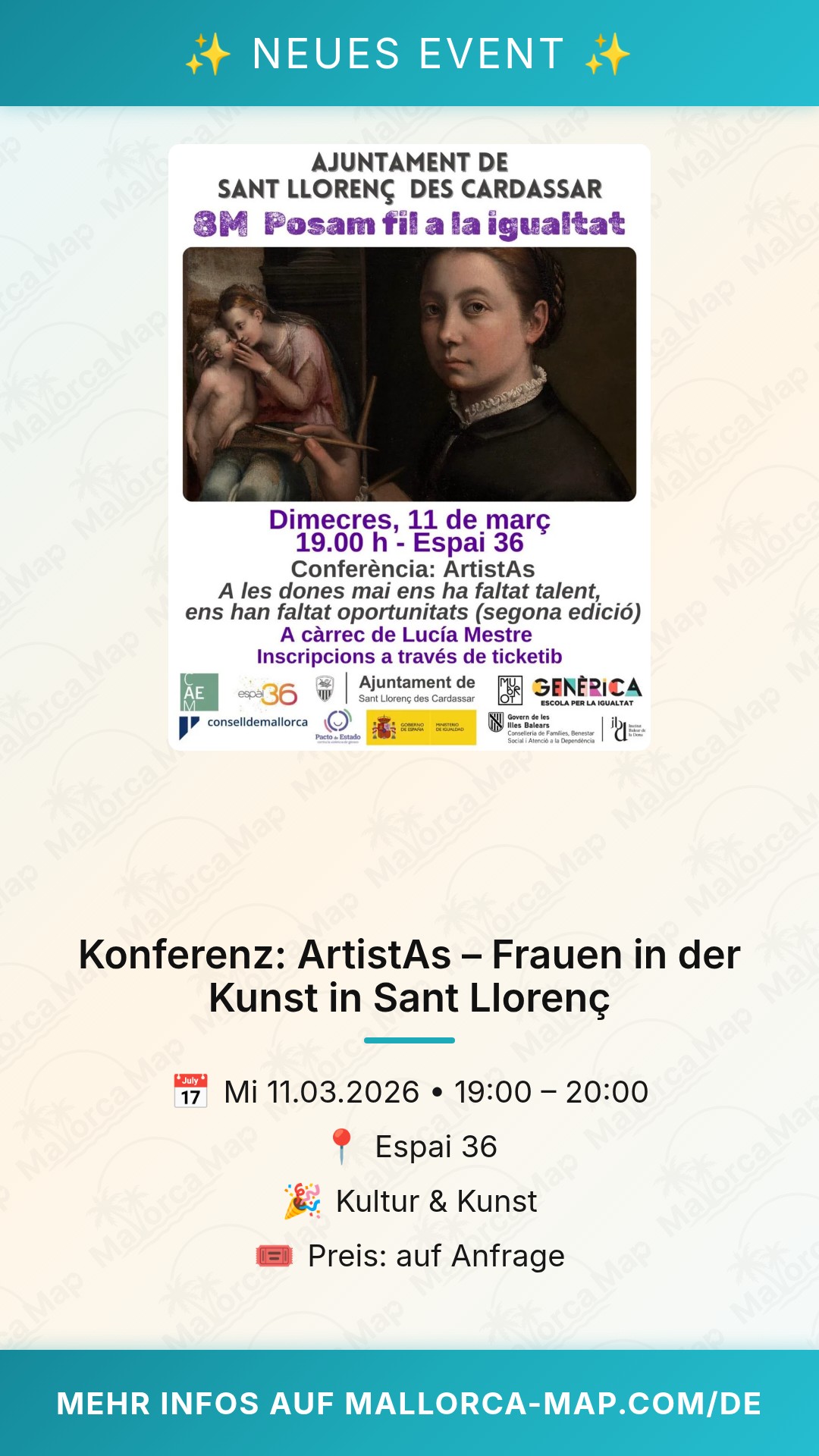Wenn du dich für die tiefere Bedeutung von Kunst und die gesellschaftliche Rolle von Frauen interessierst, dann solltest du dir den 11. März 2026 rot im Kalender markieren. Im Herzen von Sant Llorenç des Cardassar, genauer gesagt im Espai 36, findet eine ganz besondere Veranstaltung statt: die Konferenz „ArtistAs“. Unter dem Motto des Weltfrauentags (8M) lädt die Gemeinde zu einem Abend ein, der den Blick auf die Kunstgeschichte und die Gegenwart nachhaltig verändern wird. Es ist eine Einladung, über den Tellerrand hinauszuschauen und die oft unsichtbaren Beiträge von Frauen in der kreativen Welt zu würdigen.