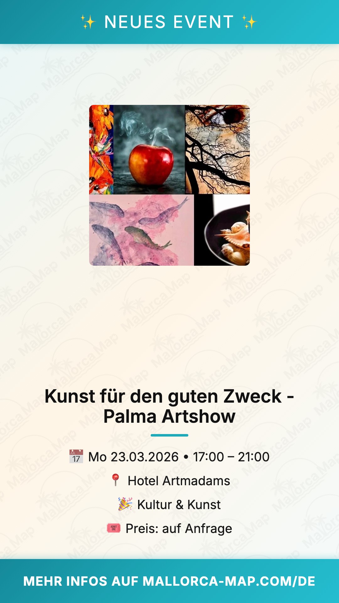 Erlebe am 23. März 2026 ein ganz besonderes Highlight in der Inselhauptstadt: Die Charity-Kunstausstellung Art for Good Reason in Palma öffnet ihre Türen. Bei dieser exklusiven Palma Artshow im Frühling kommen Kunstliebhaber und Philanthropen zusammen, um gemeinsam Großes zu bewirken. Du hast die einmalige Gelegenheit, hochwertige Werke von etablierten Künstlern Mallorcas zu bewundern, die ihre Arbeiten für einen wohltätigen Zweck gespendet haben, um lokale Familien in schwierigen Lebenslagen direkt zu unterstützen.
