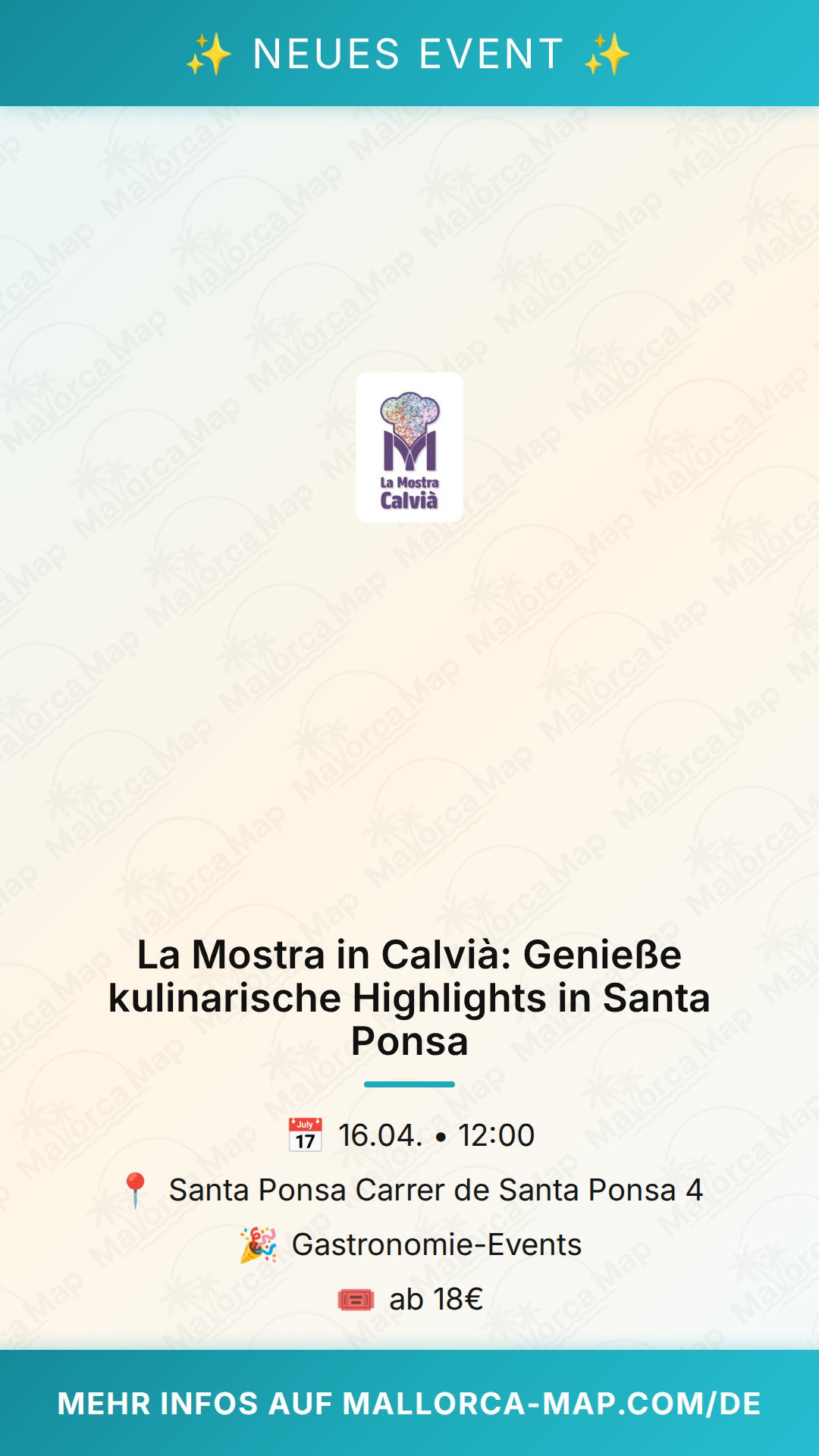 Wir freuen uns darauf, dich bei der „La Mostra“ willkommen zu heißen. Markiere dir den 16. April 2026 im Kalender und bereite dich auf ein unvergessliches Erlebnis vor, das deine Sinne verwöhnen wird. Komm vorbei und lass dich von der Qualität und Kreativität inspirieren, die Calvià zu bieten hat!
