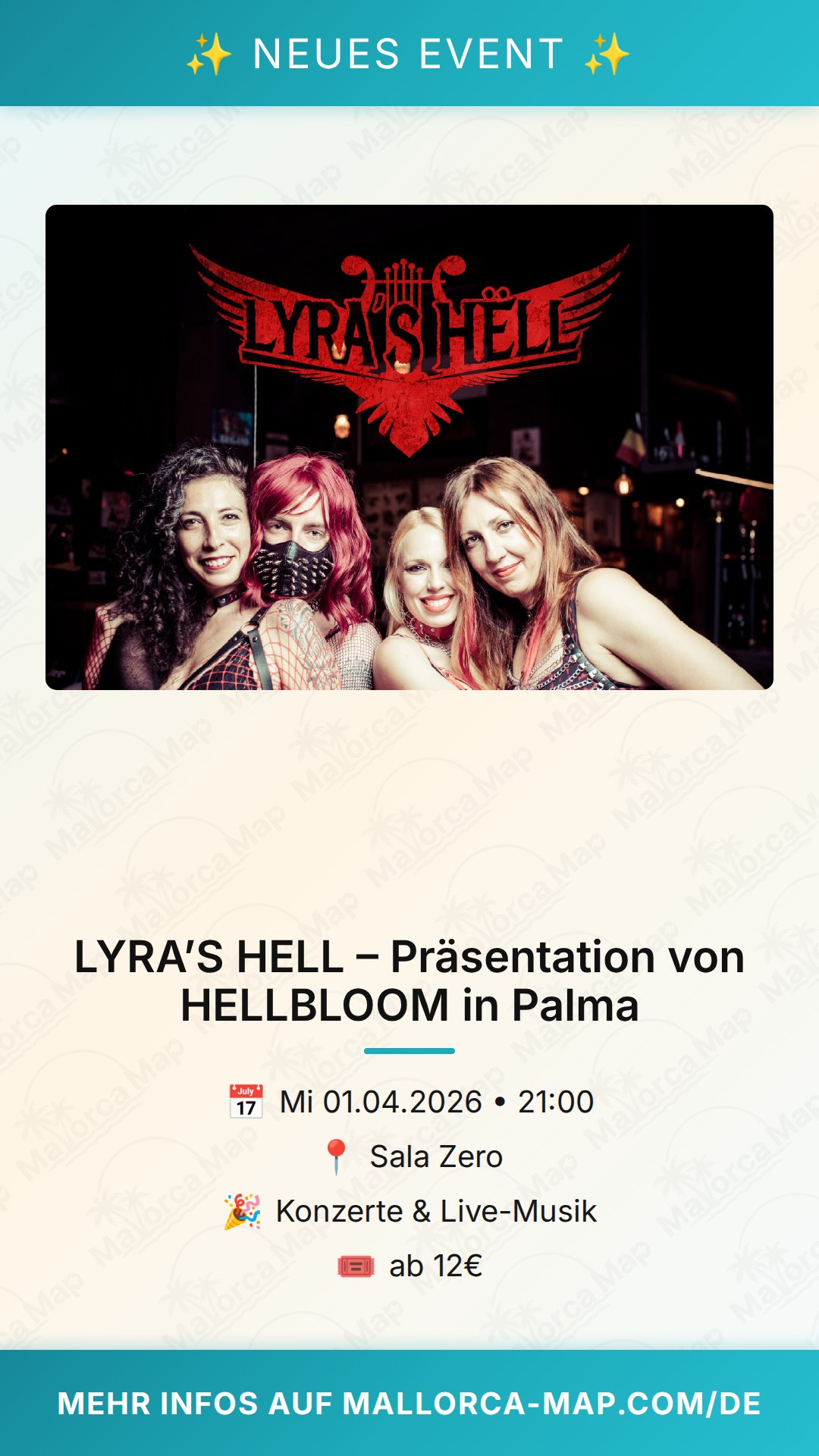 Der Einlass beginnt pünktlich um 21:00 Uhr in der Gremi de Porgadors. Mit einem fairen Eintrittspreis ab 12 Euro unterstützt du direkt das aufstrebende Talent unserer Insel. Das Es Gremi in Palma ist seit Jahren dafür bekannt, der lokalen Szene eine starke Stimme und eine professionelle Plattform zu geben. Dieser Abend verspricht, ein echter Meilenstein für die Rock-Identität Mallorcas im Jahr 2026 zu werden. Warte also nicht zu lange mit deiner Entscheidung und sichere dir rechtzeitig dein Ticket für dieses explosive Live-Erlebnis. Wir freuen uns darauf, dich vor der Bühne zu sehen, wenn LYRA’S HELL die Sala Zero zum ersten Mal so richtig zum Beben bringt!