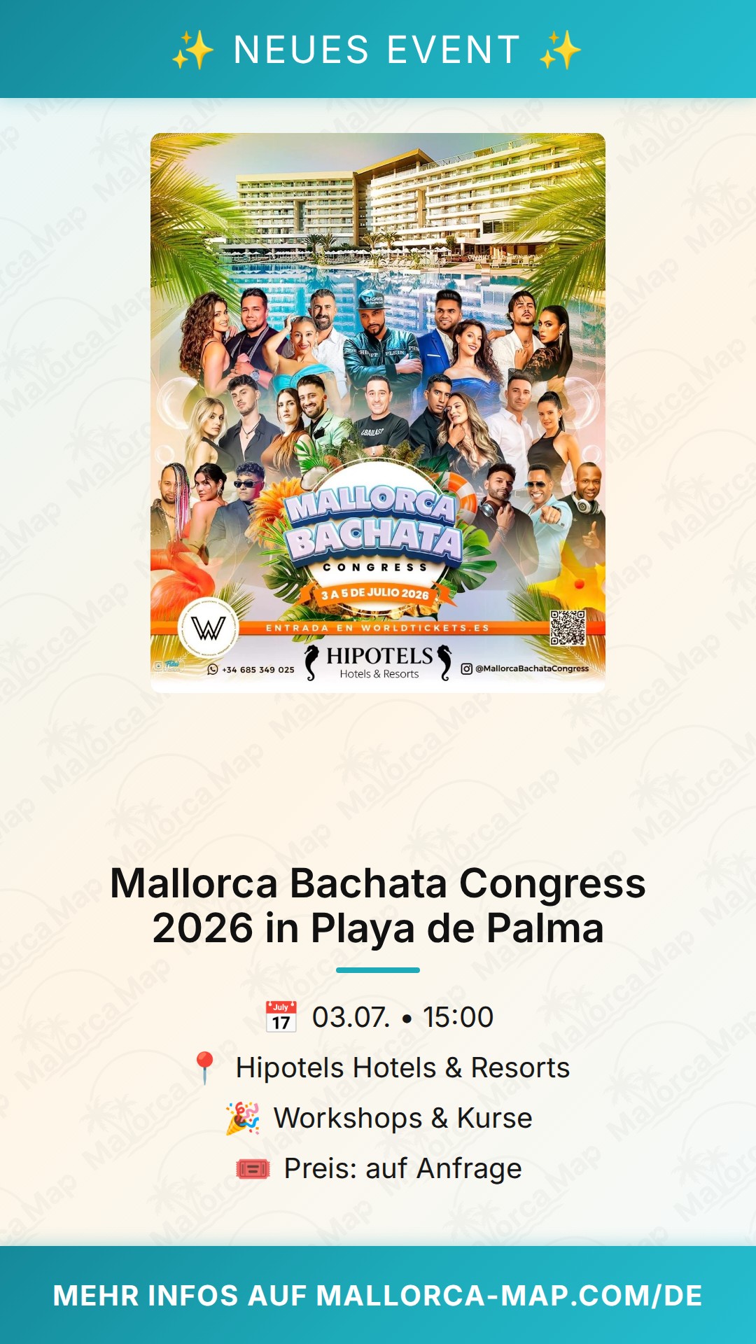 Sichere dir rechtzeitig deinen Platz für dieses Highlight im Sommer 2026. Playa de Palma ist hervorragend erreichbar und bietet die perfekte Infrastruktur für deinen Aufenthalt. Schnapp dir deine Tanzschuhe, bring deine Freunde mit und bereite dich darauf vor, die Magie der Bachata auf Mallorca zu spüren. Wir sehen uns auf der Tanzfläche!