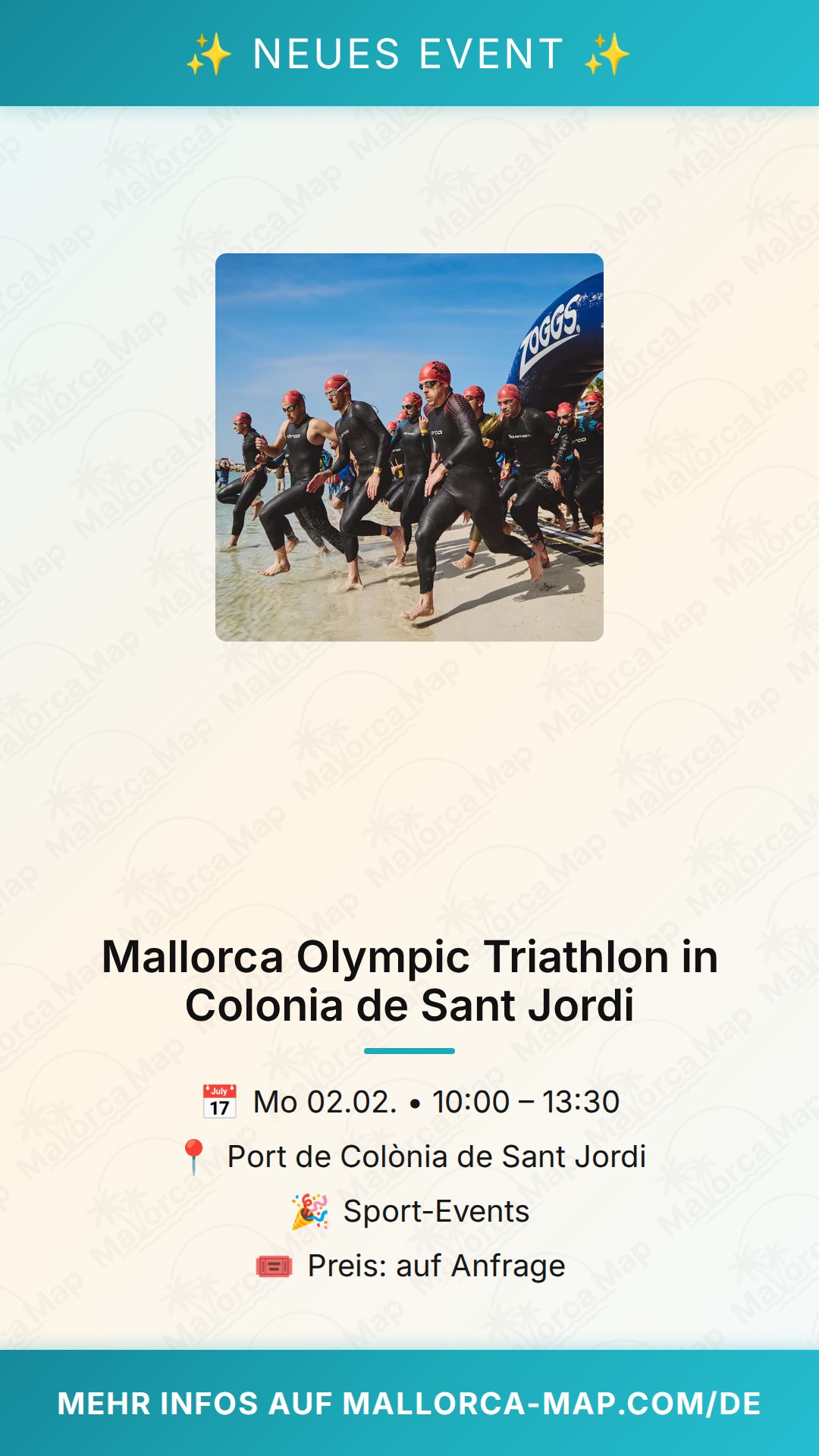 Bist du bereit für die ultimative sportliche Herausforderung im Süden der Insel? Am 2. Februar 2026 erwartet dich der Mallorca Olympic Triathlon in der malerischen Kulisse von Colonia de Sant Jordi. Dieses Event ist der perfekte Start in deine Saison und kombiniert sportliche Höchstleistungen mit der atemberaubenden Natur Mallorcas. Freue dich auf kristallklares Wasser, schnelle Radstrecken und einen emotionalen Zieleinlauf direkt am Hafen, während du deine Grenzen neu definierst und die besondere Atmosphäre genießt.