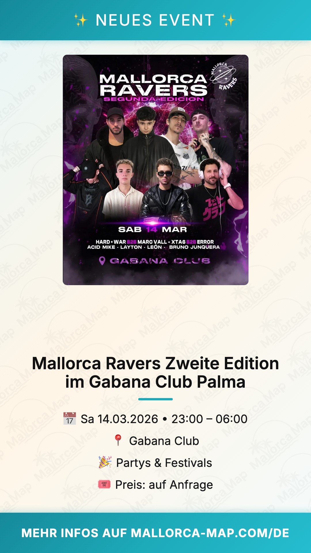 Die Mallorca Ravers Community wächst stetig, und diese zweite Edition ist der Beweis dafür, dass die Rave-Kultur auf der Insel lebendiger ist als je zuvor. Es geht nicht nur um die Musik, sondern um das Gemeinschaftsgefühl, die Freiheit und die pure Freude an der Bewegung. Schnapp dir deine Freunde, zieh deine bequemsten Tanzschuhe an und bereite dich auf eine Nacht voller Adrenalin vor. Los geht es pünktlich um 23:00 Uhr im Herzen von Palma de Mallorca. Da die Nachfrage für die Mallorca Ravers Events erfahrungsgemäß sehr hoch ist, solltest du nicht zu lange warten. Sichere dir deinen Platz auf der Tanzfläche und sei Teil einer Bewegung, die das Nachtleben von Mallorca neu definiert. Wir sehen uns im Gabana Club – lass uns gemeinsam eine unvergessliche Nacht feiern!