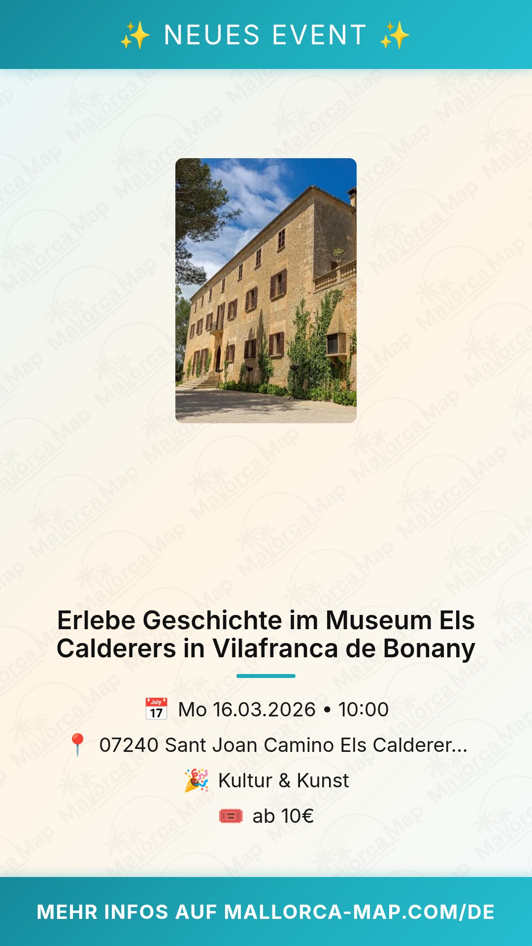 Für deinen Besuch solltest du dir ausreichend Zeit nehmen, um die vielen kleinen Details und Ausstellungsstücke in Ruhe zu entdecken. Der Eintritt beginnt ab 10 Euro, was den Zugang zu diesem kulturellen Schatz absolut lohnenswert macht. Wenn du mehr über die Geschichte erfahren oder dich auf deinen Ausflug vorbereiten möchtest, findest du weitere Informationen direkt auf mallorca-map.com/en. Schnapp dir deine Kamera, lade deine Freunde oder Familie ein und entdecke ein Stück authentisches Mallorca. Wir freuen uns darauf, dich dort begrüßen zu dürfen und wünschen dir einen unvergesslichen Tag inmitten der Geschichte von Vilafranca de Bonany. Verpasse nicht die Chance, diese beeindruckende Zeitkapsel selbst zu erleben und ein tieferes Verständnis für die Traditionen der Baleareninsel zu gewinnen.