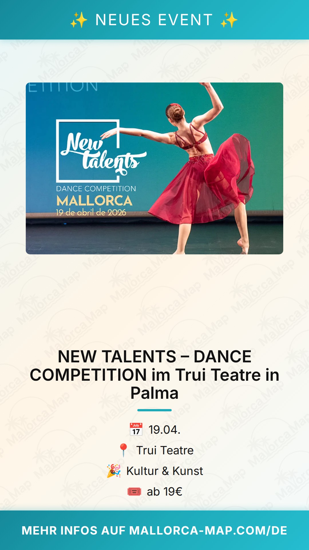 Verpasse nicht die Chance, Teil dieses besonderen Abends zu sein. Ob du selbst tanzt oder einfach die Energie der Performance genießen möchtest, der „NEW TALENTS – DANCE COMPETITION“ verspricht eine Show, die dich garantiert mitreißen wird. Komm vorbei und erlebe, wie junge Talente die Bühne in Palma zum Beben bringen. Wir freuen uns darauf, dich dort zu sehen und gemeinsam einen unvergesslichen Tag voller Tanz und Emotionen zu erleben. Mach dich bereit für eine spektakuläre Darbietung, die unter die Haut geht und dich motiviert, selbst wieder aktiv zu werden oder einfach die pure Freude am Tanzen zu feiern.