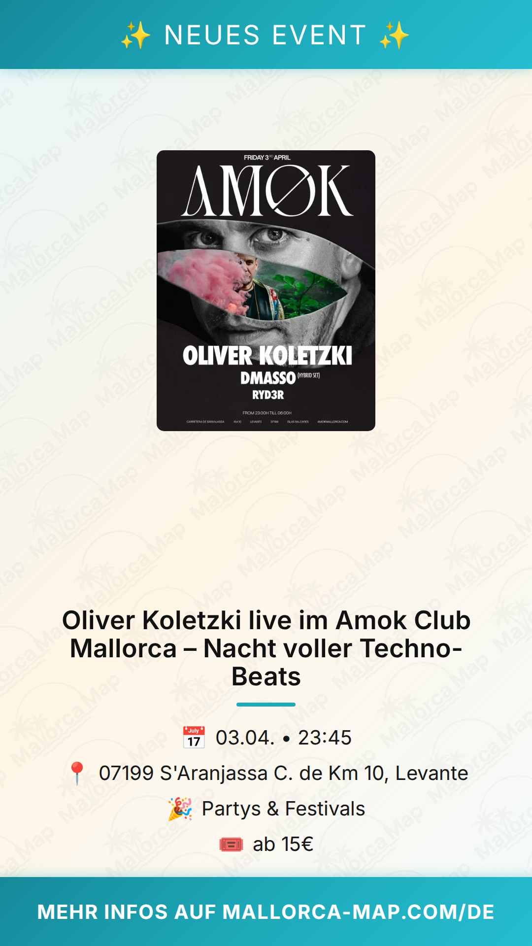 Sichere dir dein Ticket frühzeitig und sei dabei, wenn Oliver Koletzki die Insel zum Tanzen bringt. Weitere Informationen und Updates zum Line-up findest du unter amokmallorca.com. Verpasse nicht die Chance, einen der einflussreichsten Produzenten der elektronischen Musikszene hautnah in einer intimen Club-Umgebung zu erleben. Schnapp dir deine Freunde, zieh deine Tanzschuhe an und mach dich bereit für eine Nacht, die dir noch lange in Erinnerung bleiben wird. Wir sehen uns auf dem Dancefloor im Amok Club!