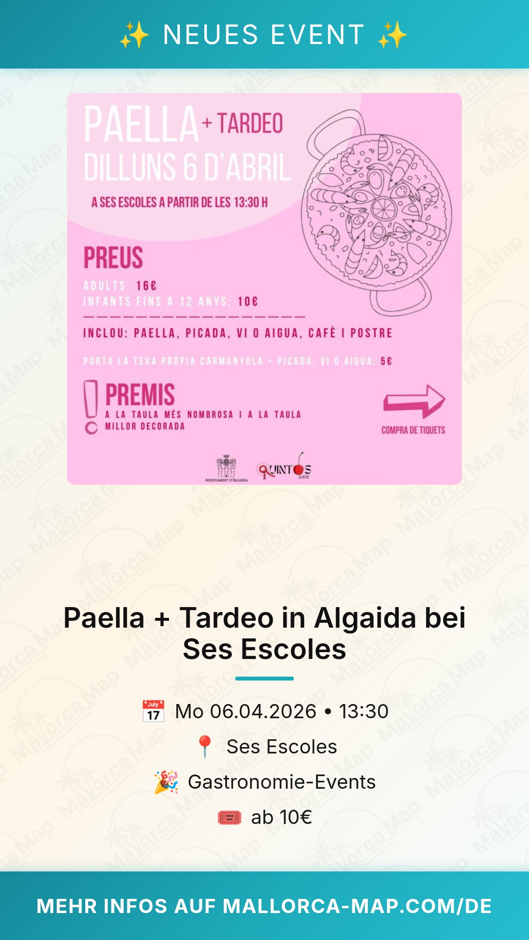 Bist du bereit für einen perfekten mallorquinischen Nachmittag im Herzen der Insel? In Algaida erwartet dich am 6. April ein ganz besonderes Highlight: Das Event "Paella + Tardeo" in der charmanten Location Ses Escoles. Wenn du das authentische Inselflair suchst und gerne in geselliger Runde genießt, dann solltest du dir diesen Termin rot im Kalender markieren. Es verbindet zwei der besten Dinge, die Mallorca zu bieten hat – erstklassige traditionelle Gastronomie und die mitreißende Stimmung eines echten Tardeo.