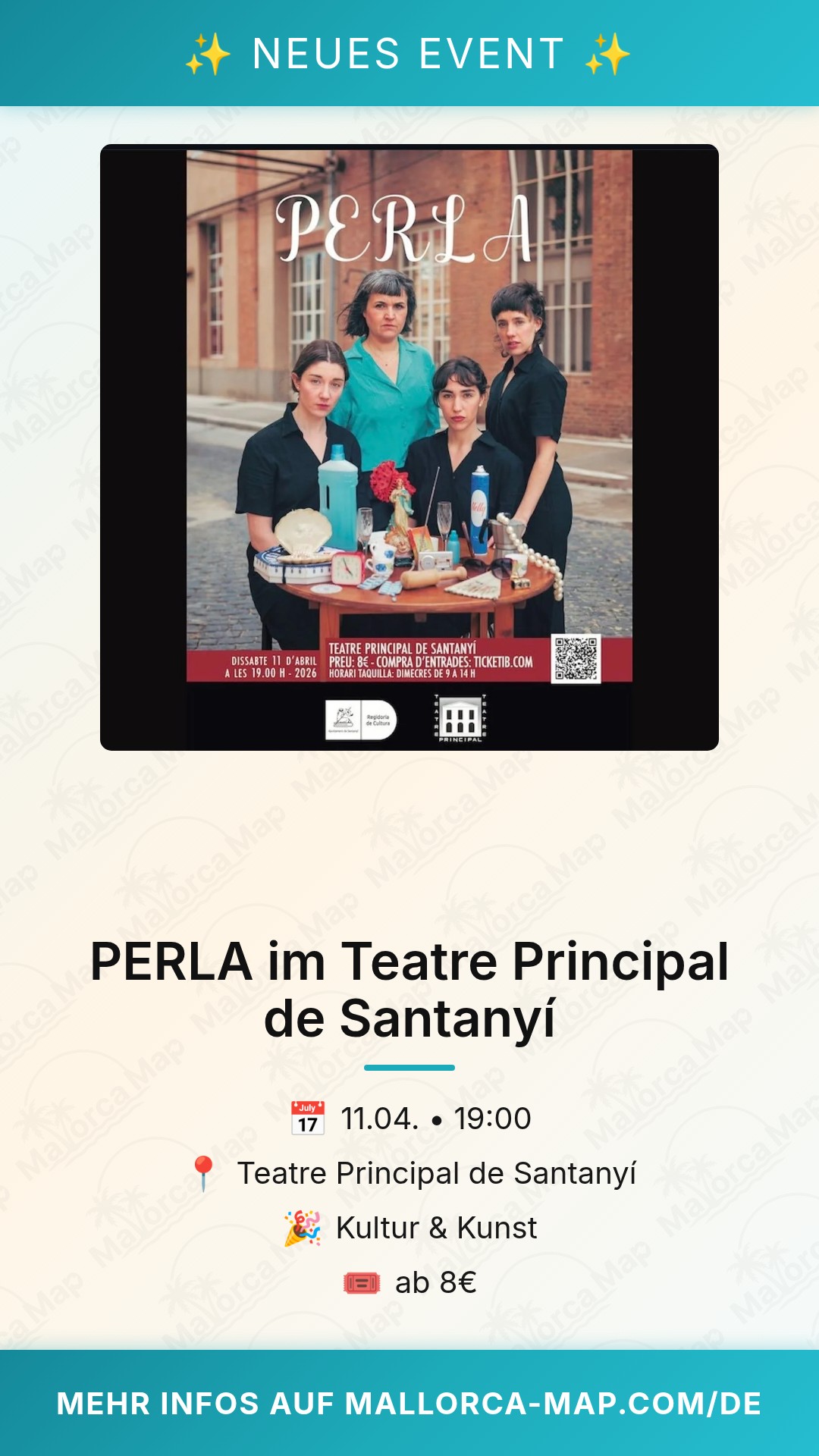 Sichere dir diesen Termin im April fest in deinem Kalender. Egal, ob du ein passionierter Theatergänger bist oder einfach nur einen besonderen Abend in einer der schönsten Städte Mallorcas verbringen möchtest – PERLA wird dich sicher nicht enttäuschen. Wir freuen uns darauf, dich im Publikum begrüßen zu dürfen und gemeinsam die Magie des Theaters zu feiern. Pack deine Freunde oder deine Familie ein und taucht gemeinsam in dieses kulturelle Highlight ein!