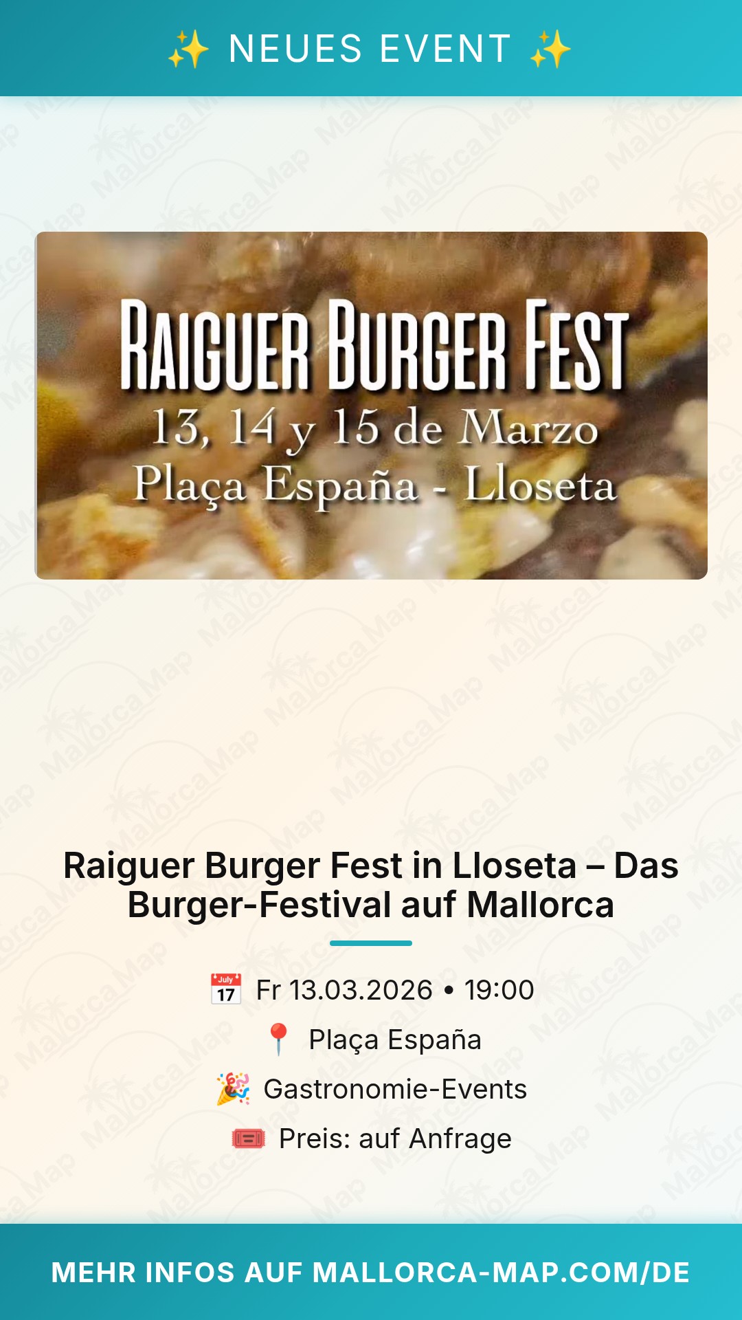 Das Raiguer Burger Fest startet um 19:00 Uhr, genau zur richtigen Zeit, um den Feierabend einzuläuten oder das Wochenende gebührend zu beginnen. Da das Event unter freiem Himmel stattfindet, bietet die Plaça España den idealen Rahmen für dieses gesellige Beisammensein. Lloseta selbst ist zudem immer einen Besuch wert und lässt sich hervorragend mit dem Zug von Palma aus erreichen, sodass du dir keine Sorgen um das Parken machen musst. Pack also deinen Hunger ein und komm vorbei!