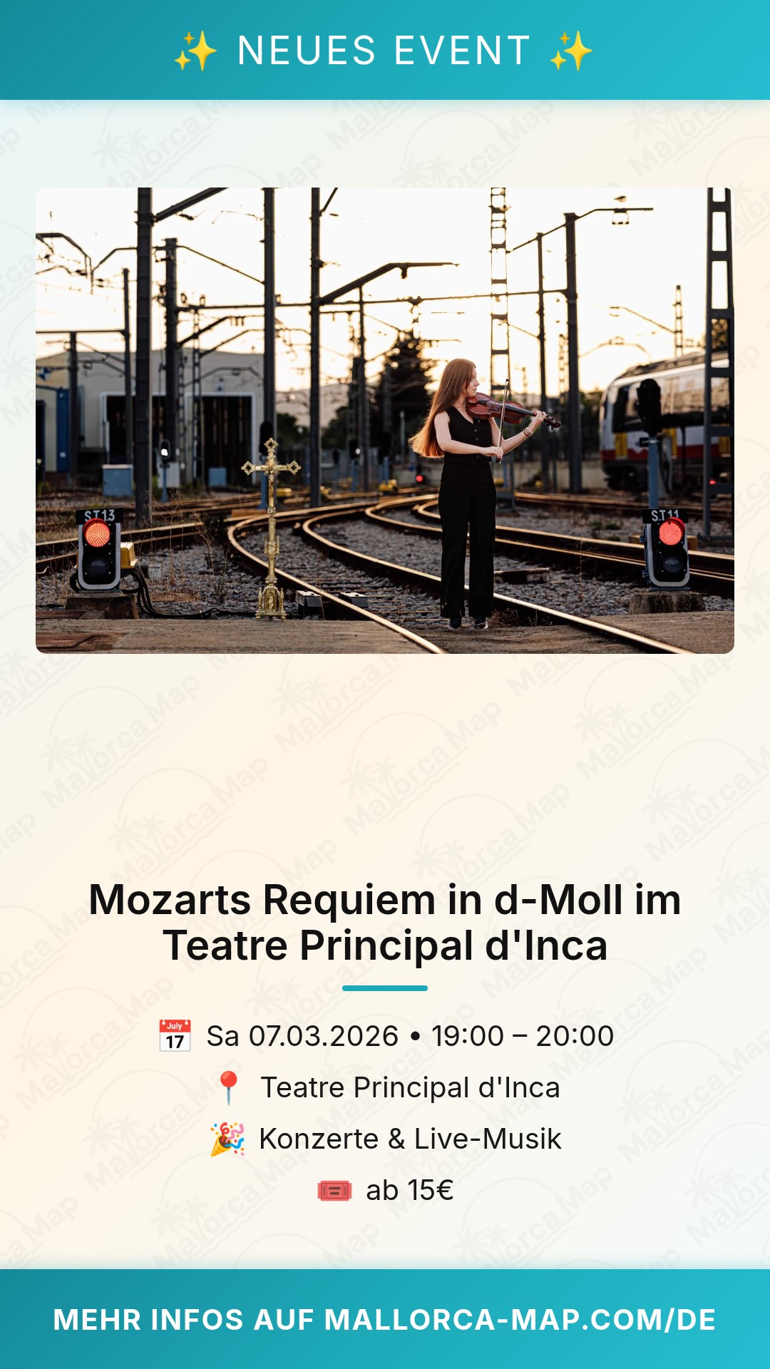 Das Teatre Principal d'Inca bietet den idealen Rahmen für dieses Konzert. Mit seiner historischen Architektur und der intimen Stimmung ist es der perfekte Ort, um sich ganz der Musik hinzugeben. Ob du ein langjähriger Klassik-Fan bist oder zum ersten Mal ein Live-Orchester erlebst, die Intensität der Chöre und die Solisten werden dich tief berühren. Besonders das berühmte "Lacrimosa" sorgt garantiert für Gänsehaut-Momente.