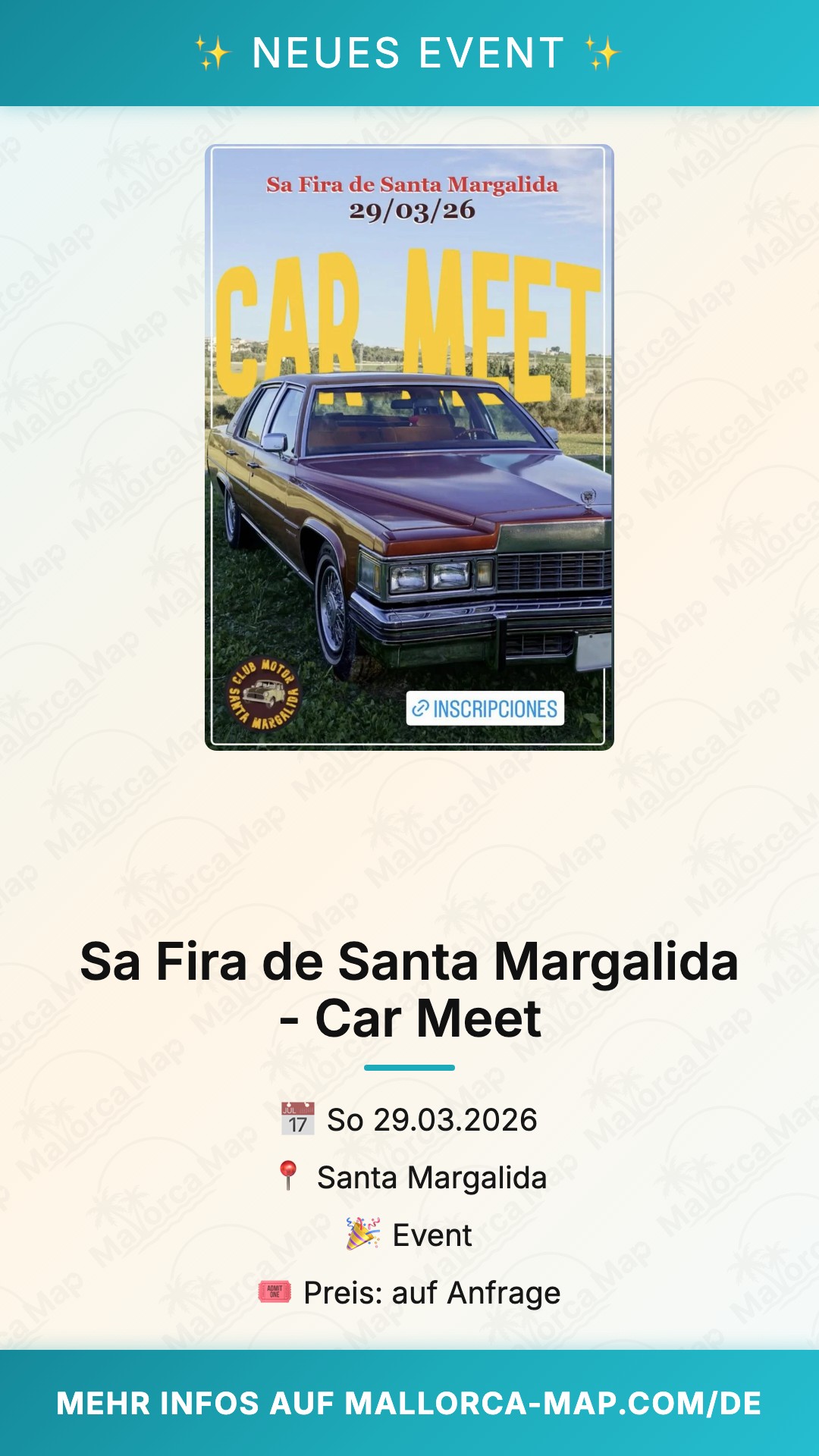 Du suchst ein echtes Highlight im mallorquinischen Frühling? Dann ist das spektakuläre Car Meet im Rahmen der traditionellen Sa Fira de Santa Margalida am 29. März 2026 genau das Richtige für dich. Erlebe eine beeindruckende Ausstellung klassischer Fahrzeuge, die das Herz jedes Motorsport-Fans höherschlagen lässt. Inmitten der historischen Kulisse des Dorfes kommen Liebhaber von PS-starken Motoren und glänzendem Chrom voll auf ihre Kosten, während das gesamte Dorf im Zeichen der Tradition feiert.