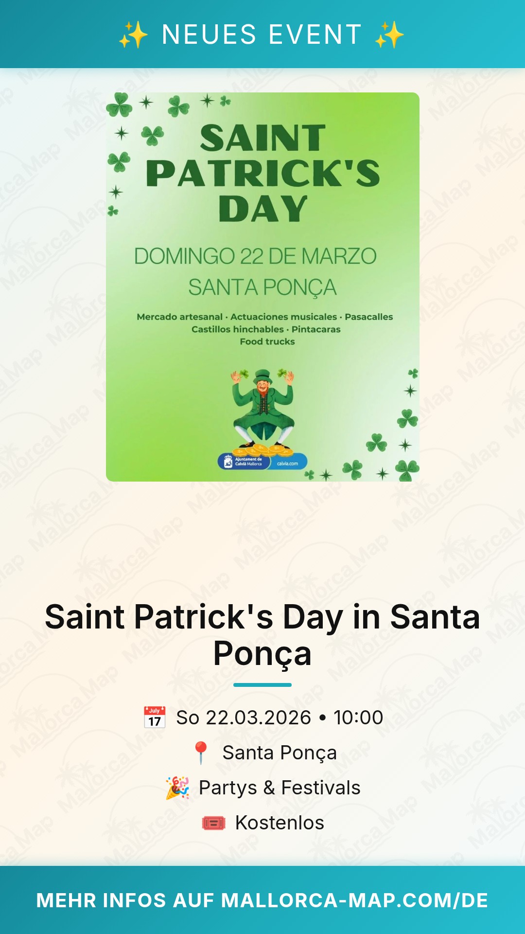 Bist du bereit für eine ordentliche Portion irischer Lebensfreude mitten auf Mallorca? Am 22. März 2026 verwandelt sich Santa Ponça in ein grünes Meer, wenn der Saint Patrick's Day groß gefeiert wird. Dieses Event ist längst kein Geheimtipp mehr, sondern ein fester Bestandteil im Veranstaltungskalender der Gemeinde Calvià. Ob du nun irische Wurzeln hast oder einfach nur gerne in geselliger Runde feierst – hier bist du genau richtig, um die „grüne Insel“ im Mittelmeer zu erleben.