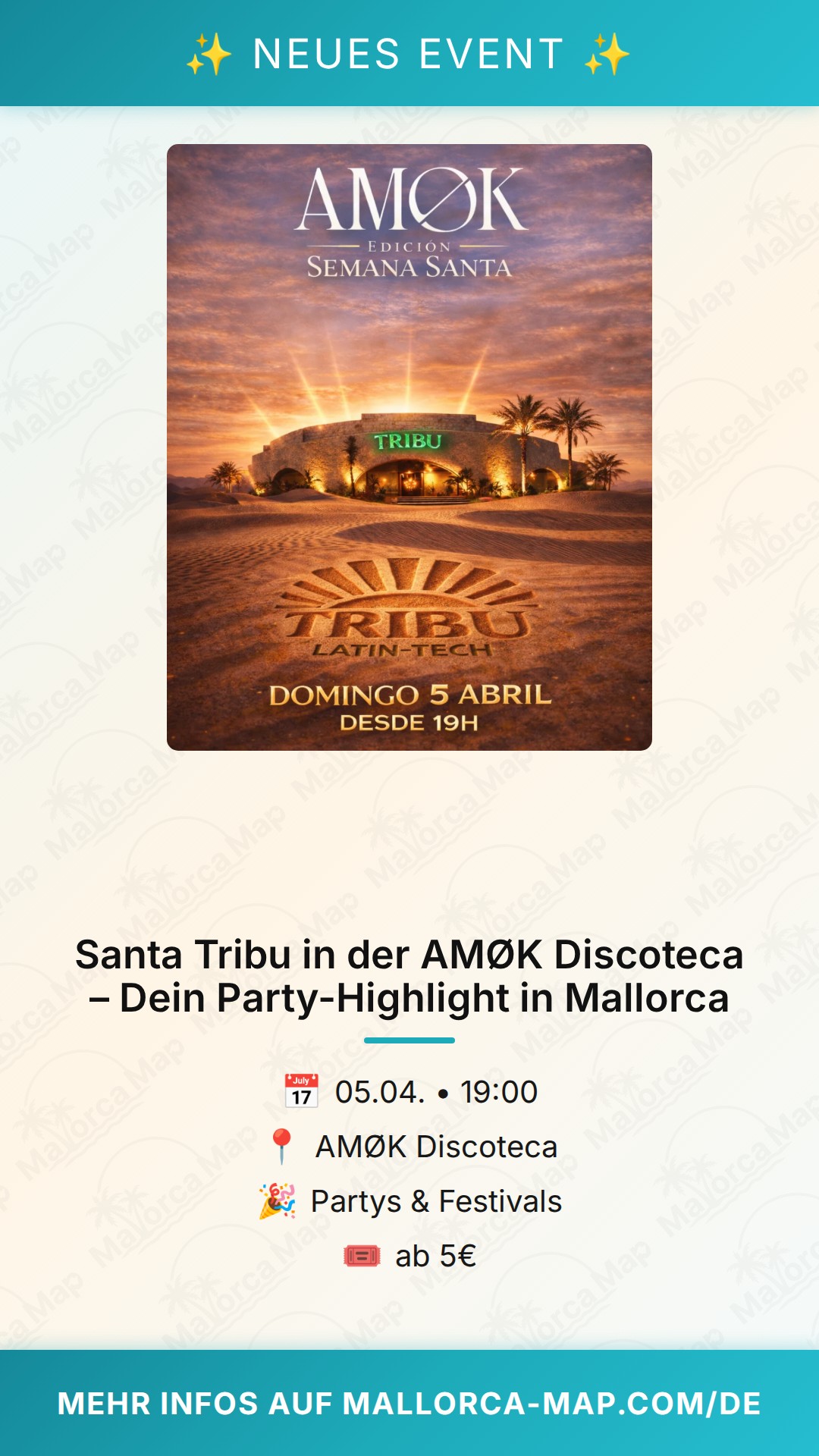 Bist du bereit für eine unvergessliche Nacht auf Mallorca? Am 5. April 2026 öffnet die AMØK Discoteca ihre Pforten für das Event „Santa Tribu“. Wenn du nach einer energiegeladenen Atmosphäre suchst, in der du den Alltag hinter dir lassen und bis in die frühen Morgenstunden feiern kannst, dann ist dieser Abend genau das Richtige für dich.