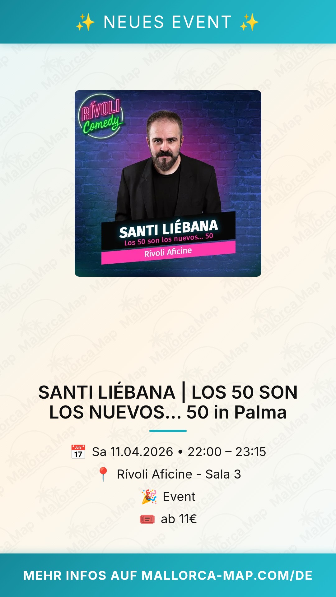 Bist du bereit für einen Abend voller Humor und Lebensfreude? Am 11. April 2026 erwartet dich im Rívoli Aficine in Palma ein ganz besonderes Highlight: Santi Liébana präsentiert sein Programm „LOS 50 SON LOS NUEVOS... 50“. In einer Welt, in der wir uns ständig fragen, wie wir altern und was das Älterwerden eigentlich bedeutet, nimmt dich der Künstler mit auf eine humorvolle Reise durch die Meilensteine des Lebens.