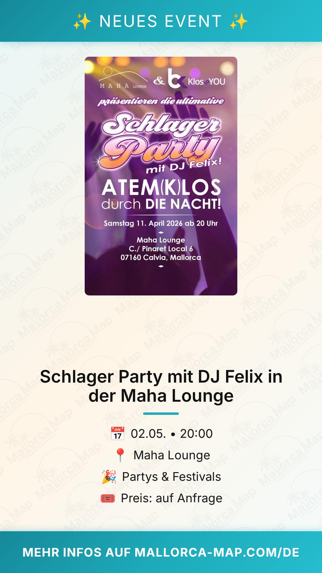 Bist du bereit für eine unvergessliche Nacht voller Mitsing-Garantie und bester Laune? Dann markiere dir den 2. Mai 2026 rot im Kalender! In der Maha Lounge in Calvia steigt die ultimative Schlager Party, die kein Tanzbein stillstehen lässt. Wenn DJ Felix an die Regler tritt, verwandelt sich die Location in ein Mekka für alle Fans des deutschen Schlagers. Gemeinsam mit „Klos to YOU“ präsentiert die Maha Lounge ein Event, das unter dem Motto „ATEM(K)LOS durch DIE NACHT“ steht – und der Name ist hier Programm.