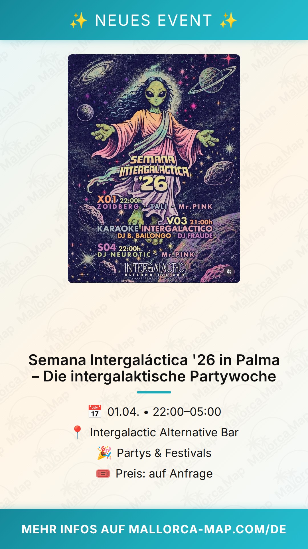 Pack deine Freunde ein, such dir dein bestes Outfit aus und sei dabei, wenn Palma zur Raumstation wird. Die Semana Intergaláctica '26 ist mehr als nur eine Party – es ist ein Erlebnis, das du so schnell nicht vergessen wirst. Wir sehen uns an der Bar in der Calle Caro!
