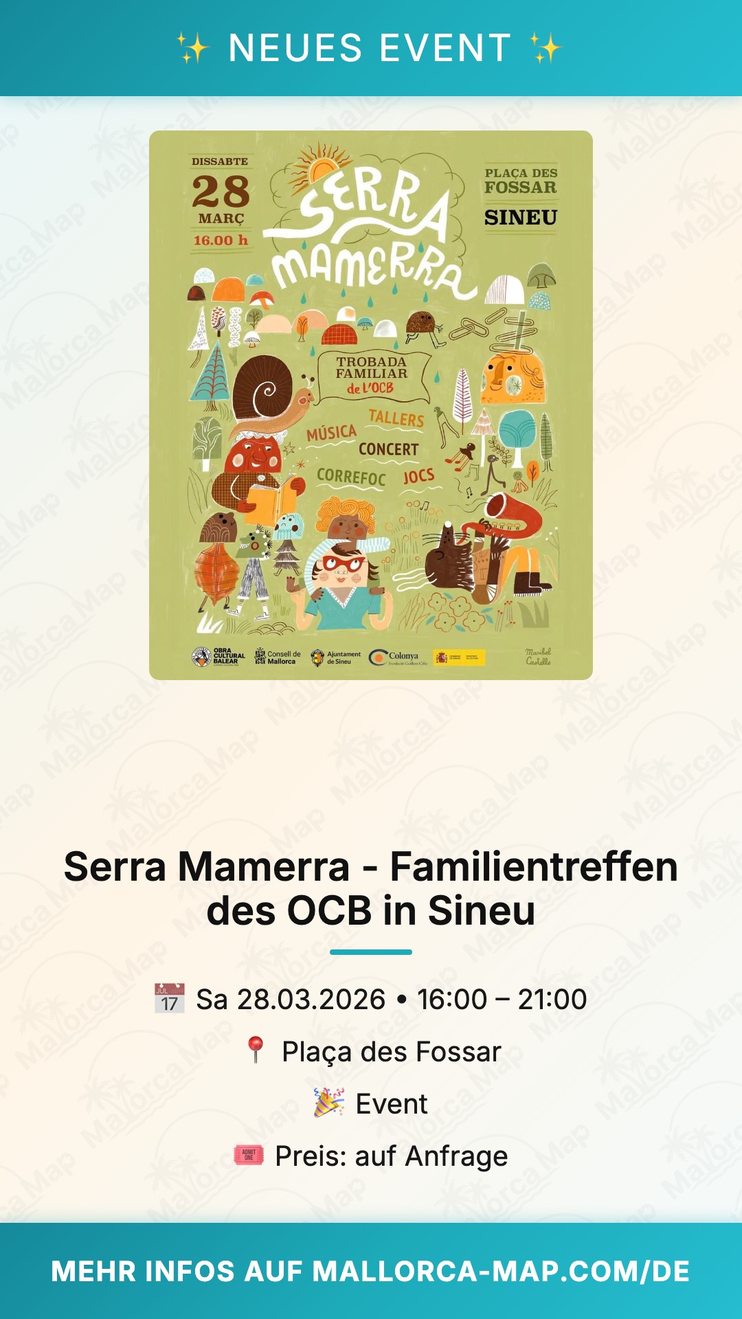 Bist du bereit für einen unvergesslichen Tag im Herzen der Insel? Das Serra Mamerra Familientreffen in Sineu am 28. März 2026 lädt dich und deine Liebsten zu einem bunten Programm ein. Dieses besondere Event, organisiert vom OCB, verwandelt den Ort in eine Bühne für kulturelle Vielfalt und gemeinschaftliches Erleben. Freue dich auf eine Mischung aus traditioneller Musik und modernen Einflüssen, die den Frühling auf Mallorca perfekt einläuten.