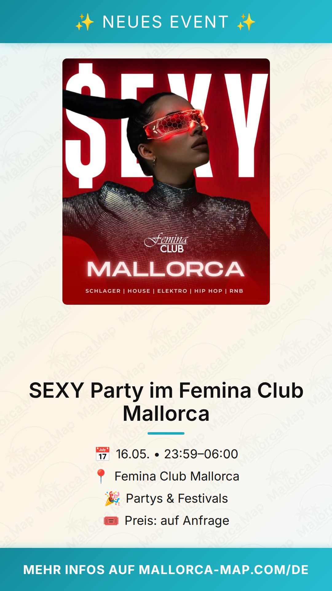 Bist du bereit für eine Nacht, die du so schnell nicht vergessen wirst? Palma de Mallorca ist weltweit bekannt für sein pulsierendes Nachtleben, aber wenn die bekannte "SEXY" Party im Femina Club Mallorca gastiert, erreicht die Stimmung in der Inselhauptstadt ein ganz neues Level. Am 16. Mai 2026 verwandelt sich der Club in der Carrer de l'Aigua in den ultimativen Hotspot für alle, die das Leben und die Musik in vollen Zügen genießen wollen.