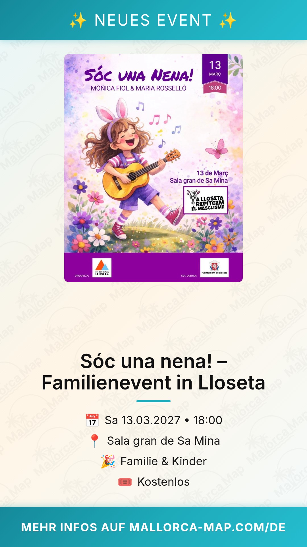 Verpasse nicht diesen besonderen Moment in Lloseta. Pack deine Familie ein und komm rechtzeitig zur Sala gran de Sa Mina, um dir einen guten Platz zu sichern. Da der Zugang kostenlos ist, ist keine vorherige Anmeldung erforderlich. Wir freuen uns darauf, dich bei „Sóc una nena!“ zu sehen und gemeinsam einen unvergesslichen Nachmittag voller Lachen und Musik zu verbringen. Markiere dir den 13. März 2027 fest in deinem Kalender – wir sehen uns in Lloseta!