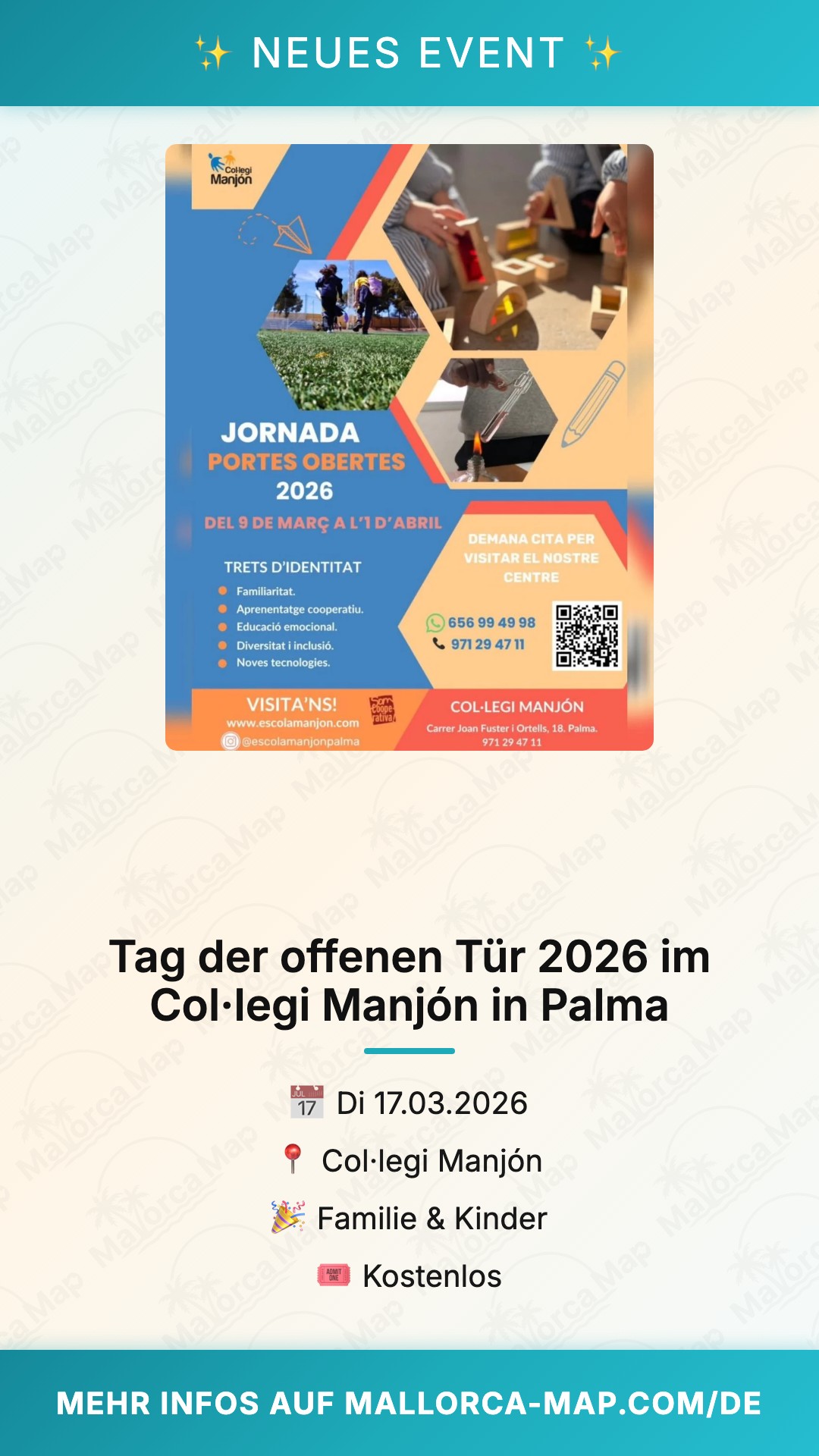 Du suchst die passende Schule für dein Kind in Palma? Dann solltest du dir den 9. März 2026 fest in deinem Kalender markieren. Das Col·legi Manjón öffnet seine Türen für den Tag der offenen Tür und lädt dich herzlich ein, einen Blick hinter die Kulissen dieser renommierten Bildungseinrichtung zu werfen. Es ist die perfekte Gelegenheit, die Atmosphäre der Schule persönlich zu erleben und alle Fragen zu stellen, die dir auf dem Herzen liegen.