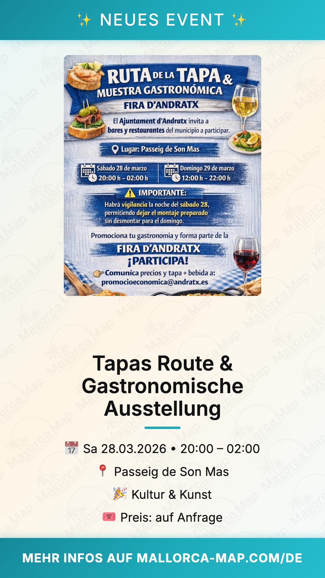 Da die Parkmöglichkeiten direkt am Passeig de Son Mas während der Messetage begrenzt sein können, empfehlen wir dir, frühzeitig anzureisen oder die öffentlichen Parkflächen am Ortsrand von Andratx zu nutzen. Der Eintritt zur Messe ist kostenfrei, sodass du dein Budget voll und ganz in die erstklassigen kulinarischen Angebote investieren kannst. Packe deine Freunde ein und erlebe einen unvergesslichen Tag voller Genussmomente im Südwesten der Insel. Wir sehen uns in Andratx – lass dir diese kulinarische Entdeckungsreise nicht entgehen!
