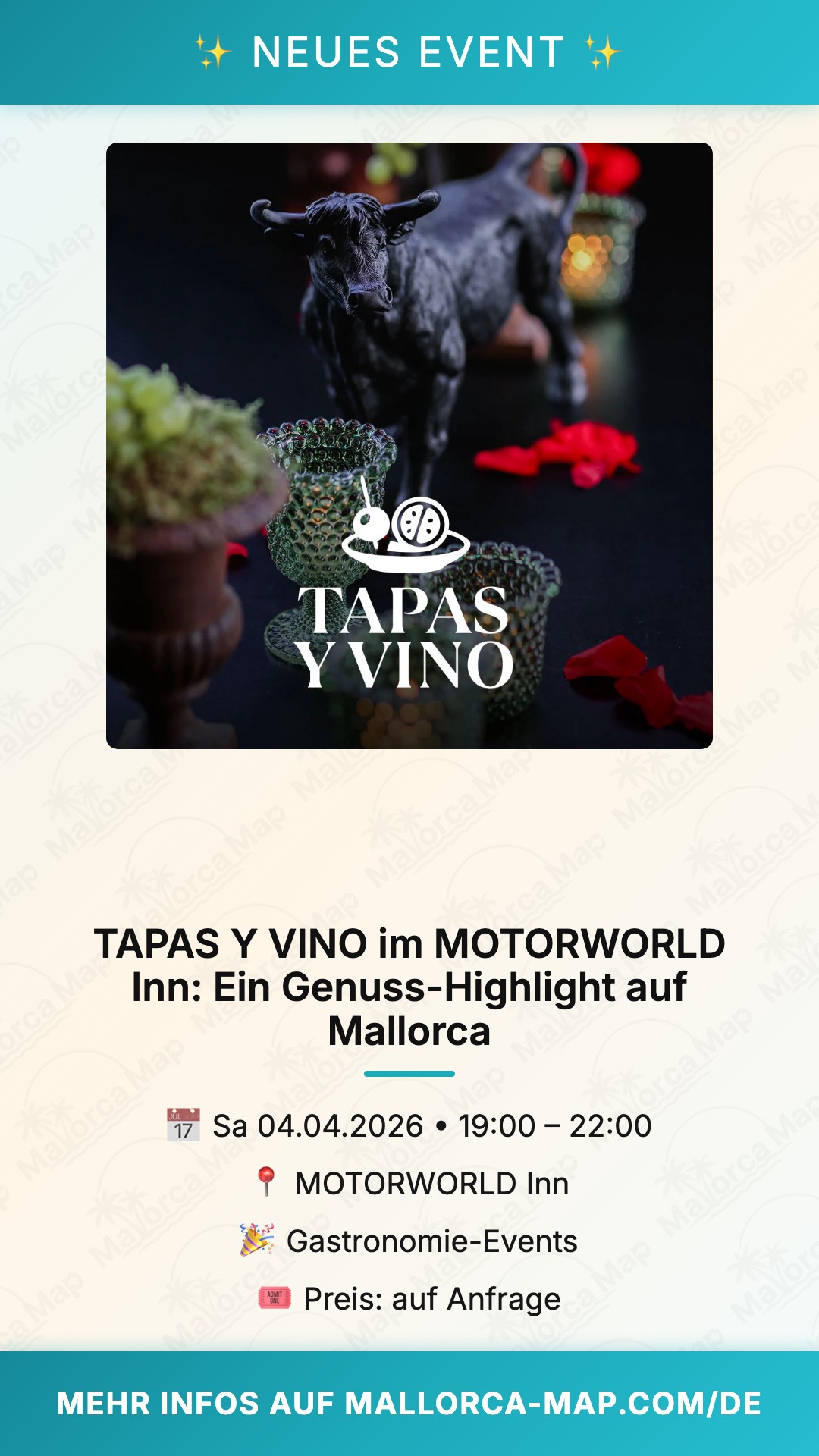 Lust auf einen Abend, der den mediterranen Lebensstil perfekt einfängt? Dann solltest du dir das Event „TAPAS Y VINO“ im MOTORWORLD Inn auf Mallorca auf keinen Fall entgehen lassen. Am 4. April 2026 verwandelt sich dieser besondere Ort in einen Treffpunkt für alle, die das Leben und den guten Geschmack in vollen Zügen genießen möchten. Wenn du die Kombination aus herzhaften, authentischen Tapas und erlesenen Weinen liebst, bist du hier genau richtig.