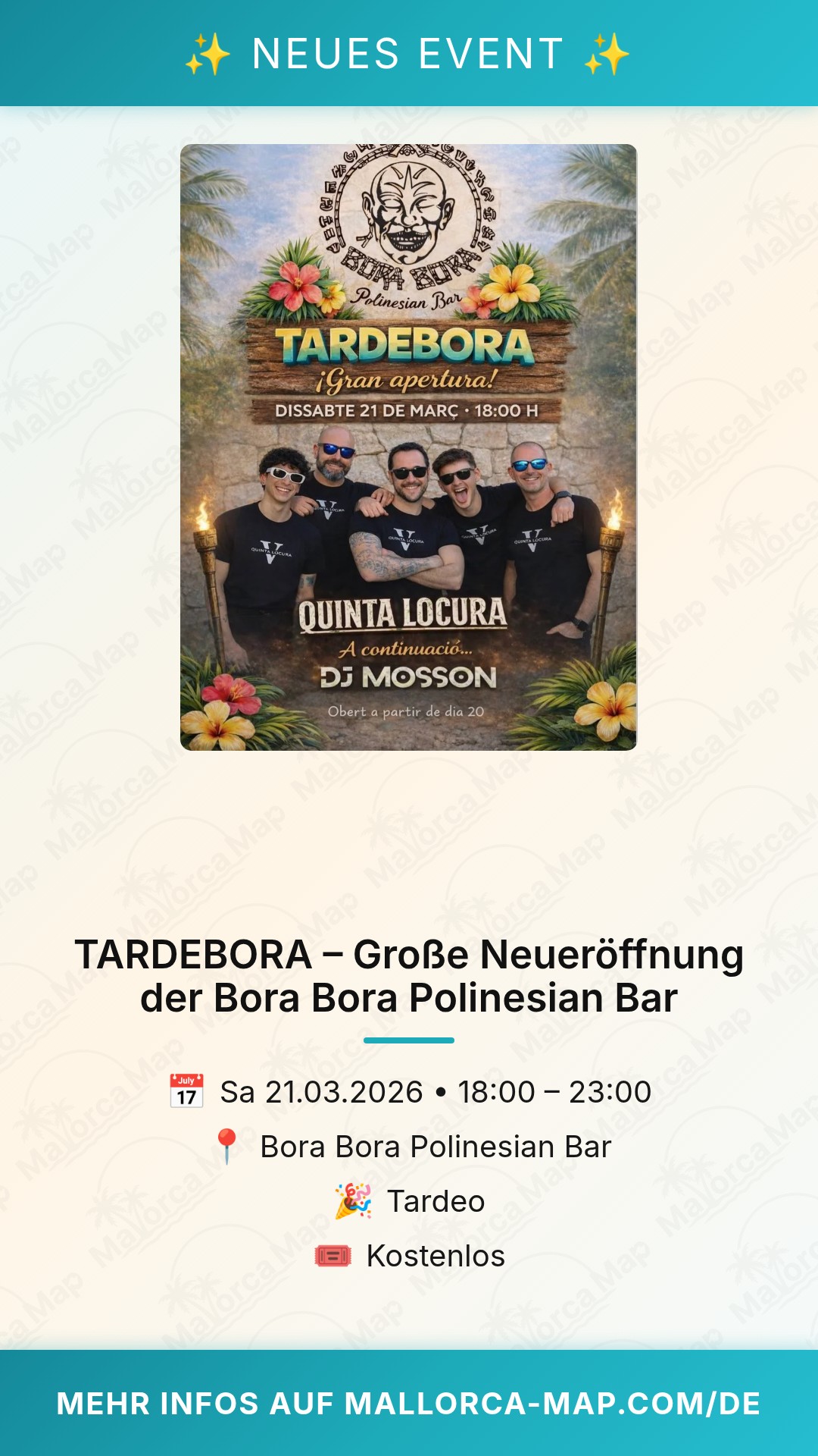 Bist du bereit für den perfekten Start in den Feierabend? Wenn die Sonne langsam tiefer steht und die Stimmung steigt, gibt es keinen besseren Ort auf Mallorca als die Bora Bora Polinesian Bar. Am Samstag, den 21. März 2026, öffnet die Bar ihre Türen für ein ganz besonderes Highlight: Die TARDEBORA – eine große Neueröffnung, die du auf keinen Fall verpassen solltest.