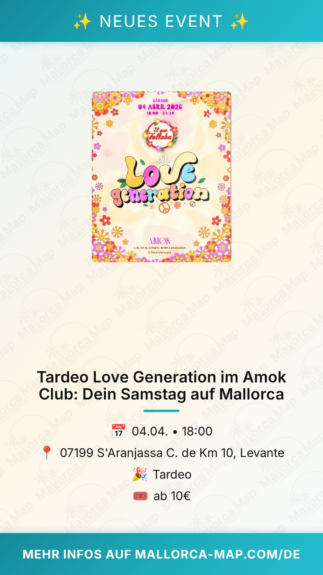 Egal, ob du dich mit Freunden triffst, um bei einem Drink in den Abend zu starten, oder ob du einfach Lust hast, neue Leute kennenzulernen – im Amok Club bist du genau richtig. Die Stimmung ist ungezwungen, herzlich und genau das Richtige, um den Samstag zu einem Highlight deines Mallorca-Aufenthalts zu machen. Das Tardeo Love Generation steht für Qualität, gute Laune und den einzigartigen Vibe, der das Feiern auf der Insel so besonders macht.